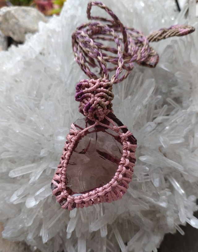 インドネシア産 アンダラクリスタル ライトパープル(光の質によりピンク系に) マクラメ編みデザインネックレス 紐長さ約84㎝位まで調節可能