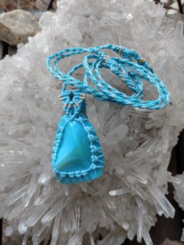 重さ:約34g(全体) 種類:インドネシア産アンダラクリスタル オパールブルー 最大幅約63mm 大きさ:最大幅約83mm(バチカン部分を含むペンダントトップのみ) 紐長さ:約88cm位まで調節可能 バチカン部:蝋引き紐(ポリエステル100%の紐に蝋引き加工を施したもの) 付属品:ポーチ ※マクラメ編み製品につきましては、特にお子様の手が届かないところでの保管をお願いいたします。 ※アンダラクリスタルはガラスとなりますので、お取り扱いにはご注意願います。気泡由来による凹みが見られる場合がございます。 ※未研磨のアンダラクリスタルを使用しているため、お洋服等を傷つける可能性がございます。そちらをご了承の上、ご購入を宜しくお願い申し上げます。 インドネシア産のアンダラクリスタルとなります。シェラネバダ産アンダラクリスタルと同様、ガラス質となります。信頼のおける現地の方とのご縁が繋がり、インドネシア産のアンダラクリスタルと出逢うこととなりました。インドネシア産のアンダラクリスタル達は、どれもとても温かい手触りと印象で、大変優しく柔和な波動で包み込んでくれるかのようです。 インドネシア産アンダラクリスタルのカラーバリエーションは多様にございますが、こちらはミルキーな半透明のオパールブルーとなります。光の質や角度によりミルキーなアンバーのようにも光って見え、大変神秘的な印象を受けます。持つ方のハートを開き、バランスを保ちヒーリングし、コミュニケーション能力のサポートストーンとなってくれるでしょう。 このパワーストーンとデザインにピンと来た方、お見逃しなく宜しくお願いいたます。
