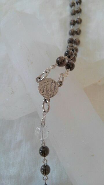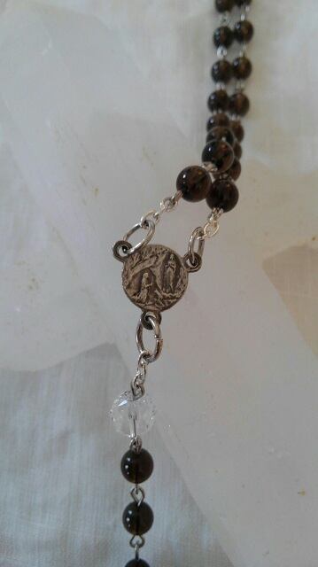Silver925製クロス(マーカサイト装飾)・聖母マリア様センターメダイ(フレンチアンティーク)・スモーキークォーツ・スターカット水晶 ハンドメイドロザリオ 輪の長さ約68~70cm