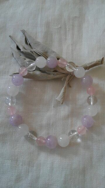 石:ラベンダーアメシスト約8,5mm、ホワイトジェイド約8,1mm、ローズクォーツ約6,2~6,4mm、水晶約7,4mm