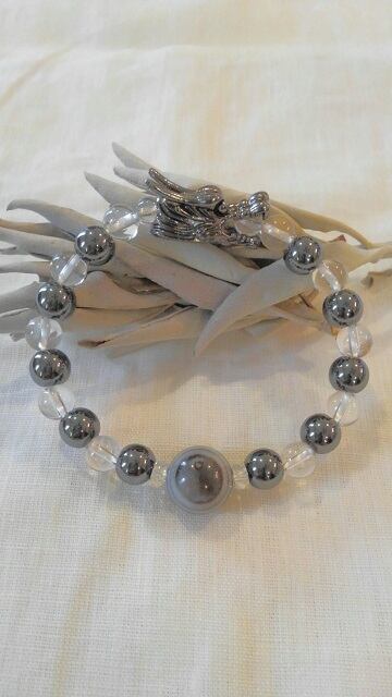 Special Price ★ 天眼石・ヘマタイト・水晶・ドラゴンヘッドデザインメタルパーツ ★ デザインブレスレット 内径約16~16,5cm