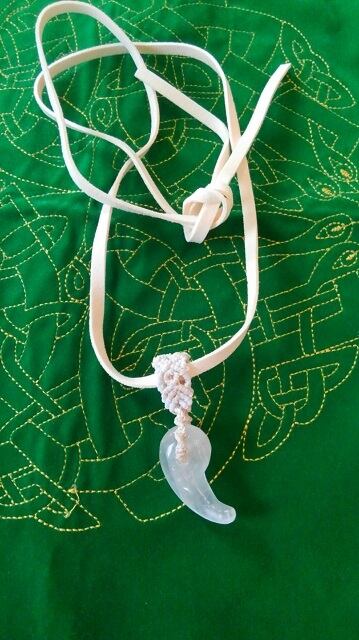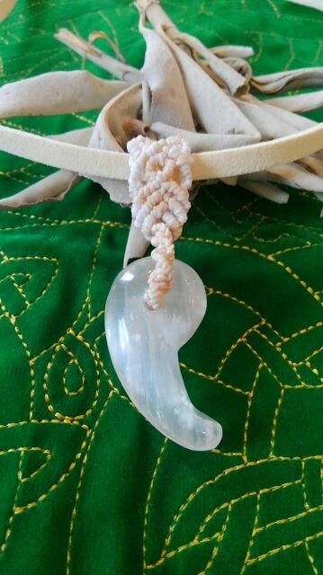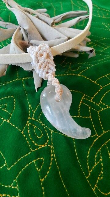 セレナイト勾玉 ☆ マクラメ編みデザインペンダントトップ&マイクロスエード紐 重さ約11~12g