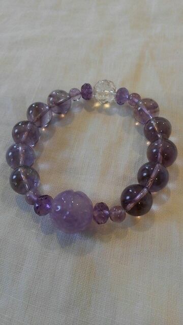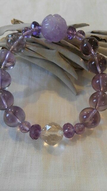 ロータスカット(蓮彫り)アメシスト・アメシスト・スモーキーファントムアメシスト・スターカット水晶 デザインブレスレット 内径約15,3~15,8cm