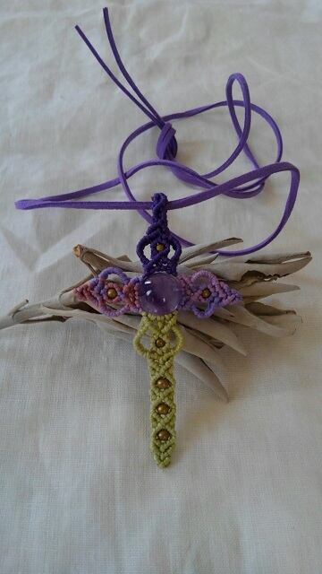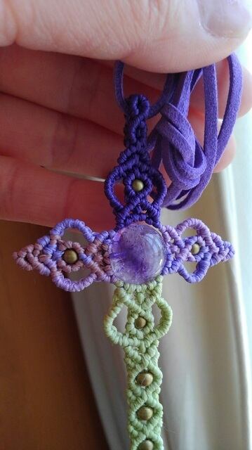 アメジストエレスチャル★ クロスモチーフ・マクラメ編みペンダントトップ&スエード調紐 重さ約8g