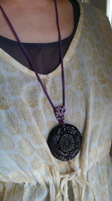 太極八卦・龍・鳳凰彫り ★ レインボーオブシディアン マクラメ編みペンダントトップ&スエード調紐 重さ約51g