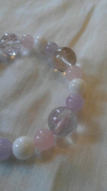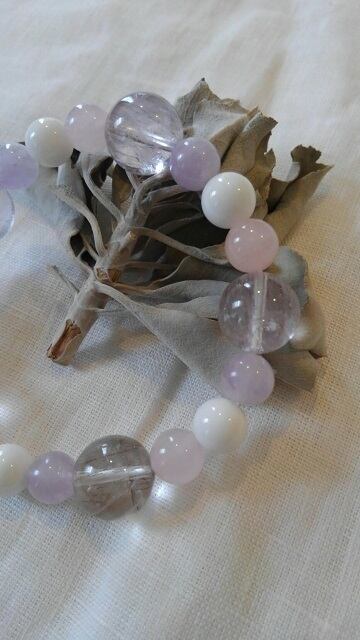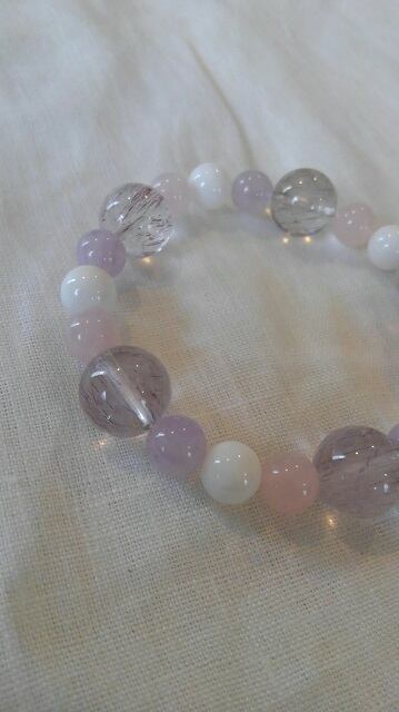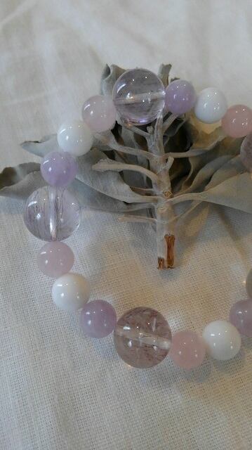 石:アメシストエレスチャル(スーパーセブン)約12,6~13mm、ラベンダーアメシスト約8,2~8,4mm、ホワイトオニキス約8,4~8,6mm、ローズクォーツ約8,1~8,3mm