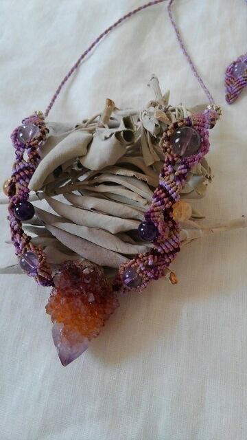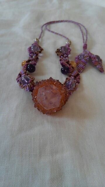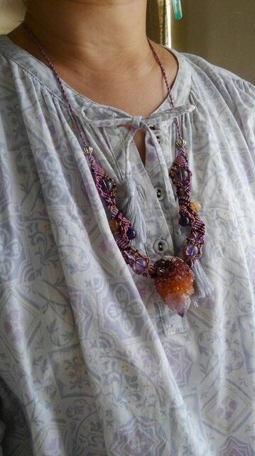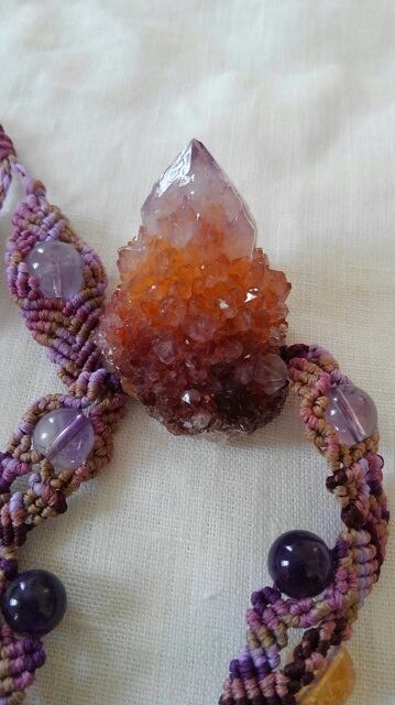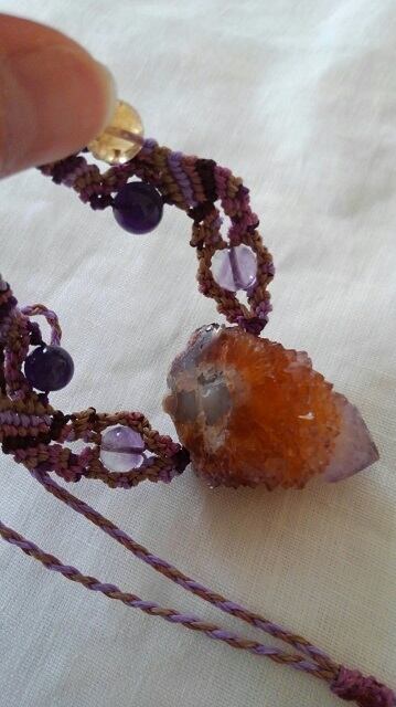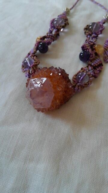 南アフリカ産カクタスクォーツ(スピリットクォーツ)・ファントムアメシスト・ラベンダーアメシスト、アメシスト・シトリン マクラメ編みデザインネックレス 長さ約70cm位まで調節可能