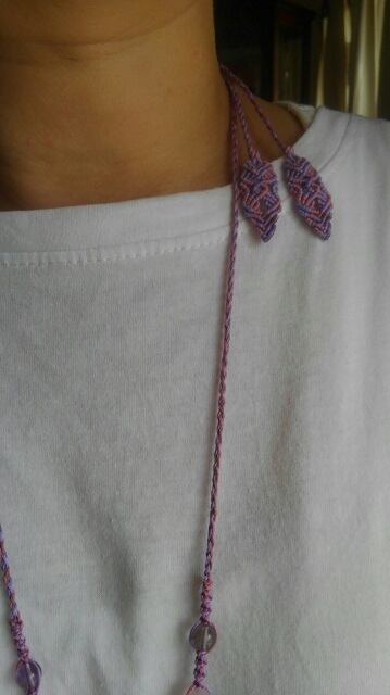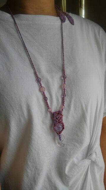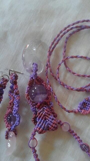 アメジスト勾玉・アメジストエレスチャル(スーパーセブン)・ローズクォーツ・アメジスト・マクラメ編みデザインネックレス&ローズォーツ勾玉・アメジスト・マクラメ編みデザインピアス 長さ約96cm位まで調節可能