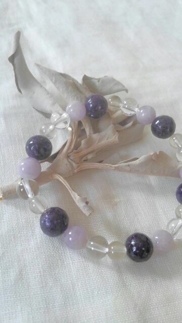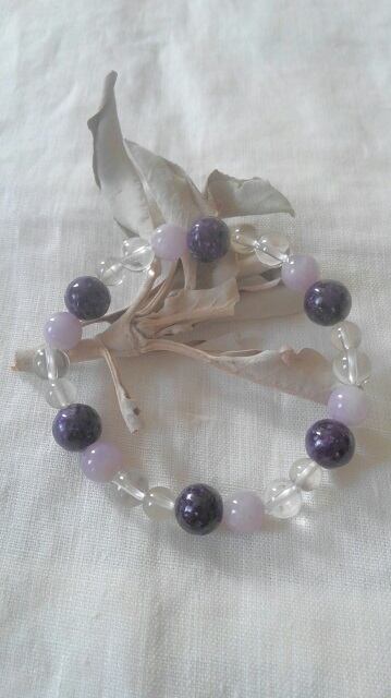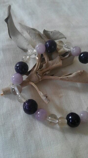 石:レピドライト(手磨き)約9,5mm、ラベンダーアメシスト約8mm、水晶約7,5mm、レモンクォーツ約6mm
