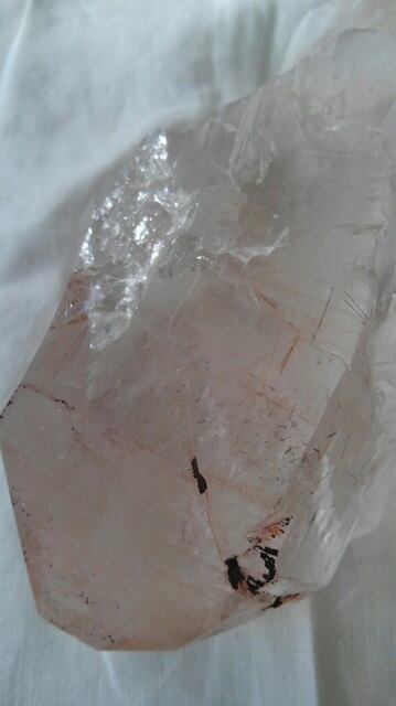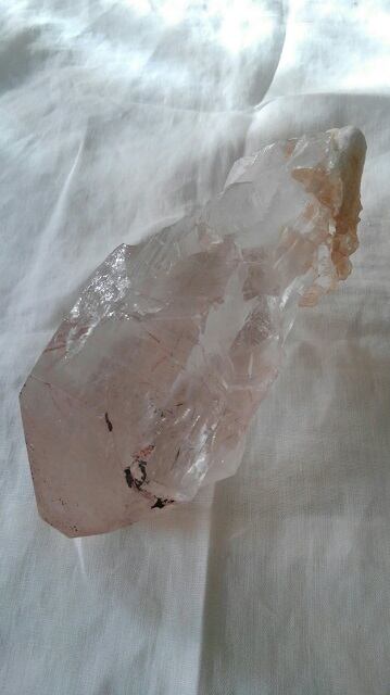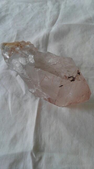 水晶全体に透明感があり、美しいブロンズルチルクォーツやブラックルチルクォーツが内包されております。ルチルクォーツはチタンやセージナイト等鉱物の針状結晶がインクルージョン(内包)された水晶をさします。結晶中の針はキューピッドダーツともいわれキューピッドの矢といわれています。ルチルクォーツは活力と活気を与えるダブルパワーストーンとして知られ、肉体と精神を活性化させ、ファイティングスピリッツやオーラを強化し運気の向上を促すとされます。そして水晶の表面には含まれる鉄分により、ピンク色からオレンジ色の天然のグラデーションが大変美しく見られます。