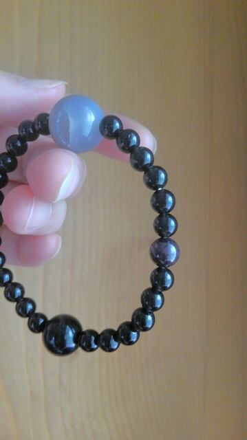 石:ドゥルージー(笑口)アゲート約16㎜、モリオン(黒水晶)約12㎜、ブラックスギライト約8㎜、オブシディアン約6㎜