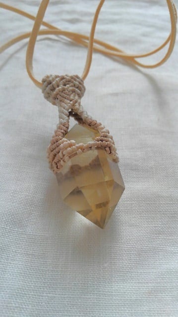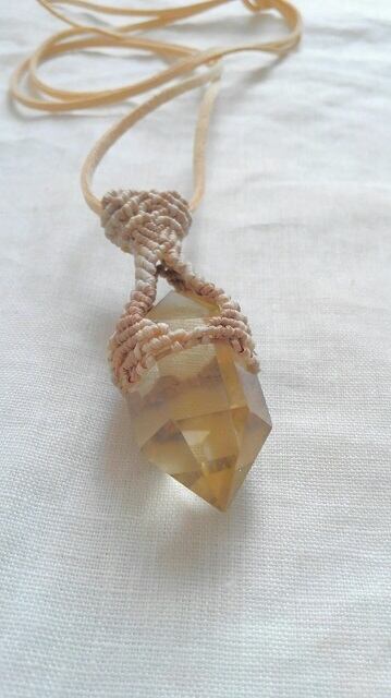 シトリン・ダブルポイントポリッシュ マクラメ編みデザインペンダントトップ&スエード調紐 ☆ ネックレス 重さ約24g