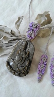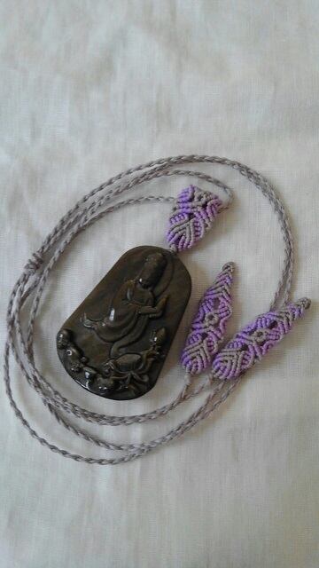 観音菩薩彫り・ゴールデンオブシディアン マクラメ編みデザインネックレス 長さ約106cm位まで調節可能