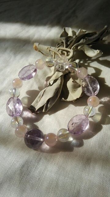 アメジストエレスチャル・オーバルカットアメジスト・花彫りフローライト・ローズオーラクォーツ・エンジェルオーラクォーツ デザインブレスレット 内径約15~15,5cm