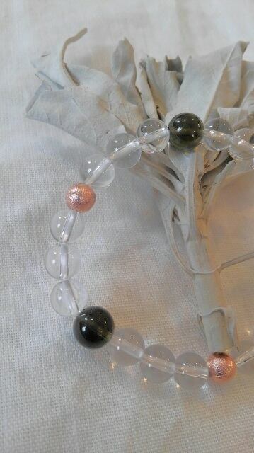 石:モルダバイト約7,5~8㎜、ナミビア産ギベオン(ピンクゴールドコーティング)約6㎜、水晶約7㎜