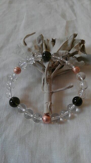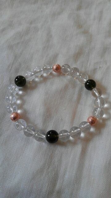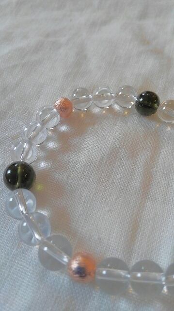 【限定一本】 モルダバイト・ナミビア産ギベオン(ピンクゴールド)・水晶 ★ デザインブレスレット 内径約14,5~15cm