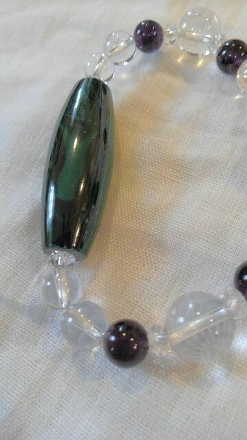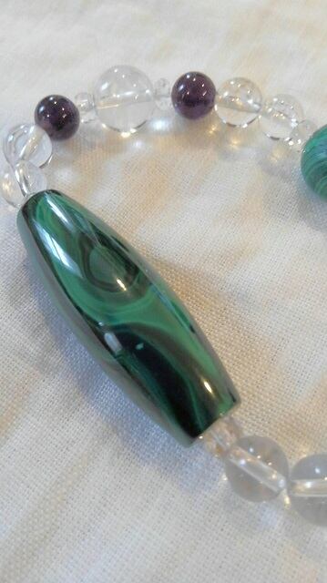 天珠型マラカイト・マラカイト・アメシスト・千手観音菩薩彫り水晶・水晶 デザインブレスレット 内径約14~14,8cm
