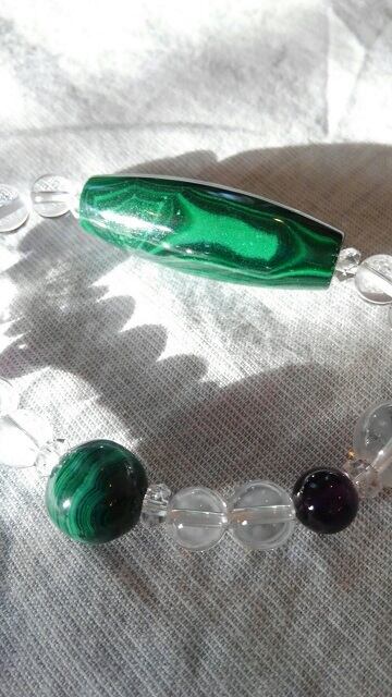 マラカイトやアメシストを含むため、月光浴や音、ホワイトセージ等の香りによる浄化がお勧めとなります。(日光浴や流水はお避け下さいませ。)
