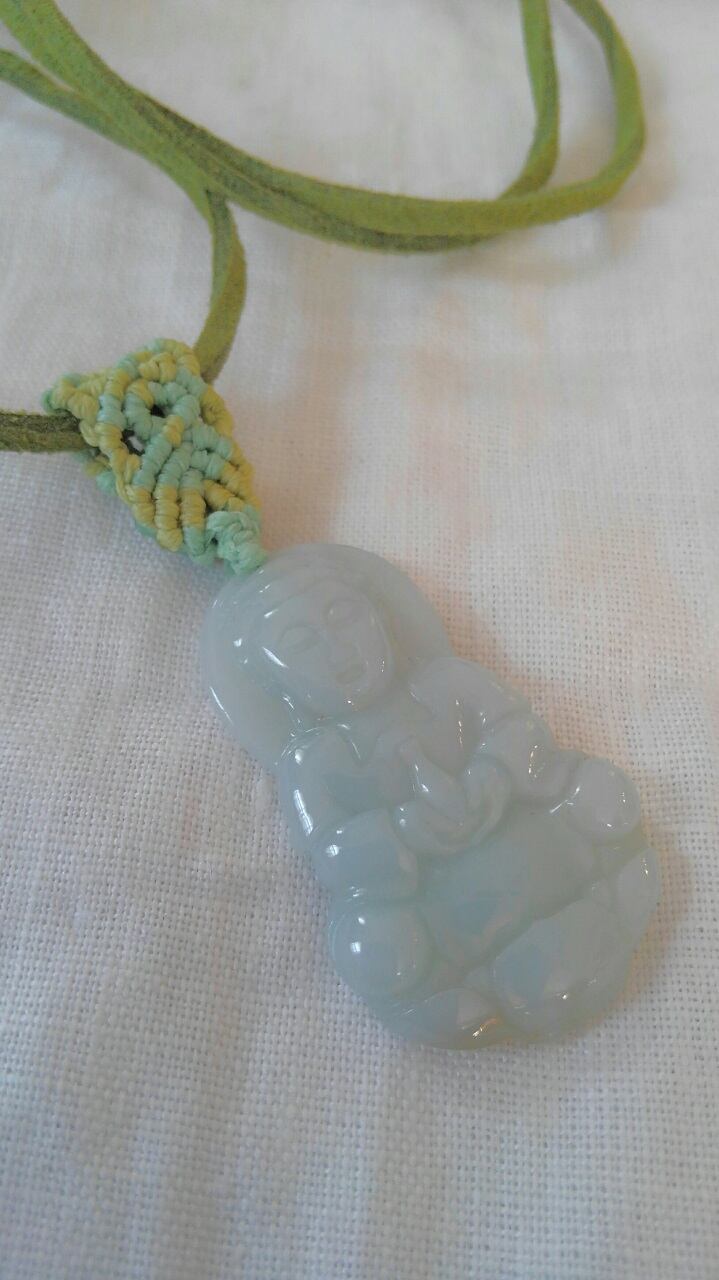 仏様彫り翡翠・マクラメ編みペンダントトップ&スエード調紐 重さ約10g