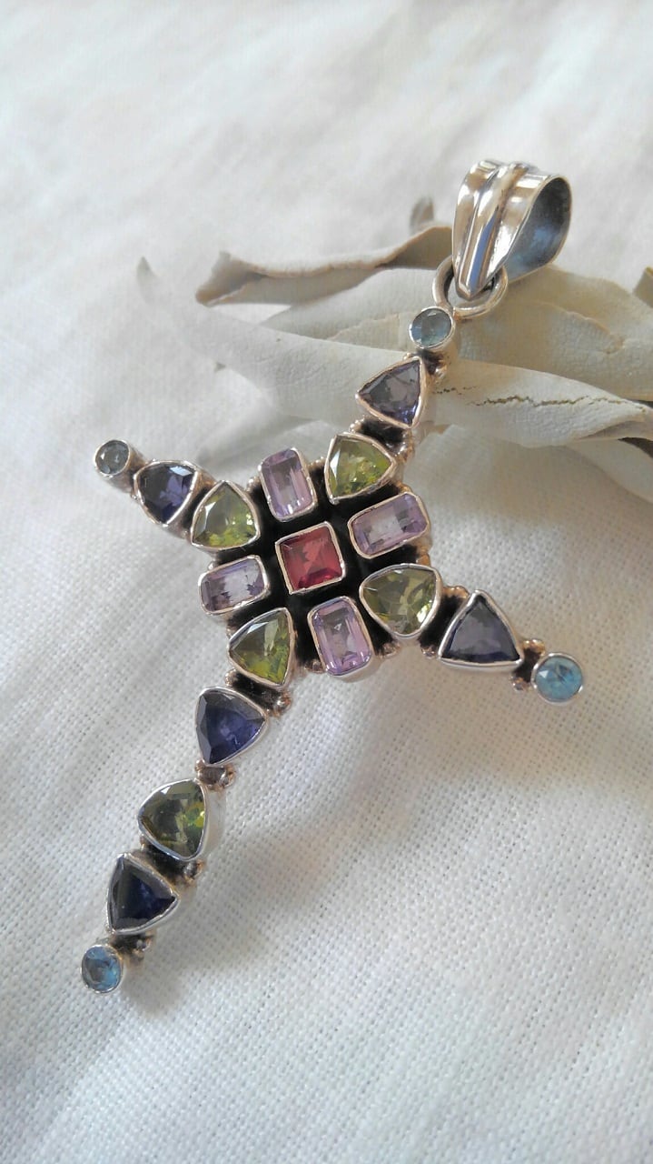 インド・ジャイプール 半貴石(ペリドット・ガーネット・アメシスト等)クロスデザインペンダントトップ 重さ約8~9g