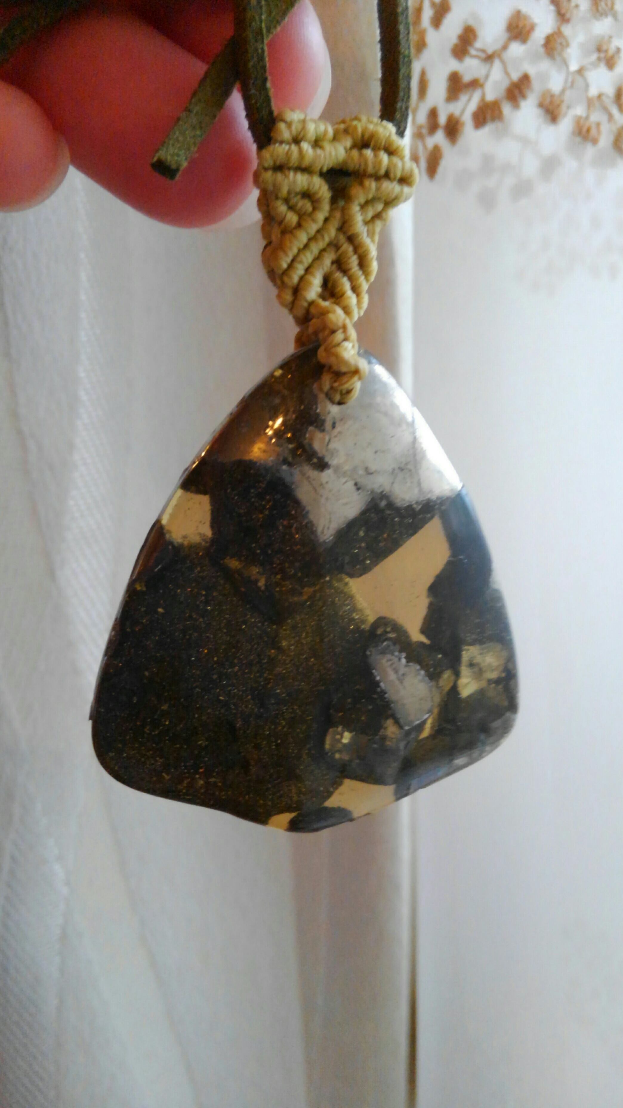 パイライト in クォーツ(パイライトの水晶コーティング)マクラメ編みペンダントトップ&スエード調紐 重さ約28g