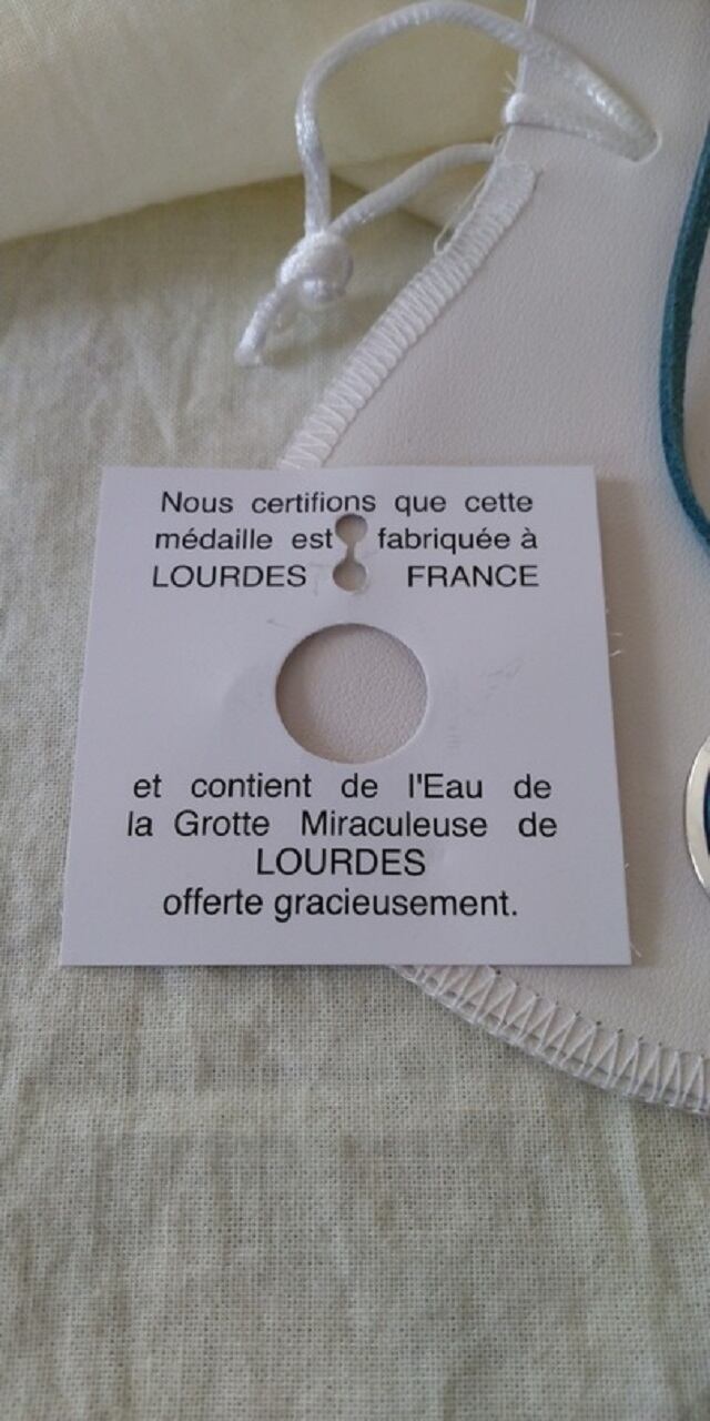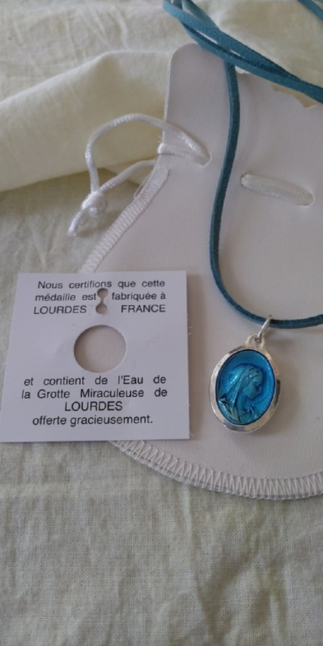 カトリック教会の巡礼地、ルルドの泉の聖水が取り付けられた、聖母マリア様のペンダントトップ&スエード調紐となります。表面にはブルーエナメルで彩られた、優しい表情をされた聖母マリア様の横顔、裏面にはルルドの泉の聖水が取り付けられております。