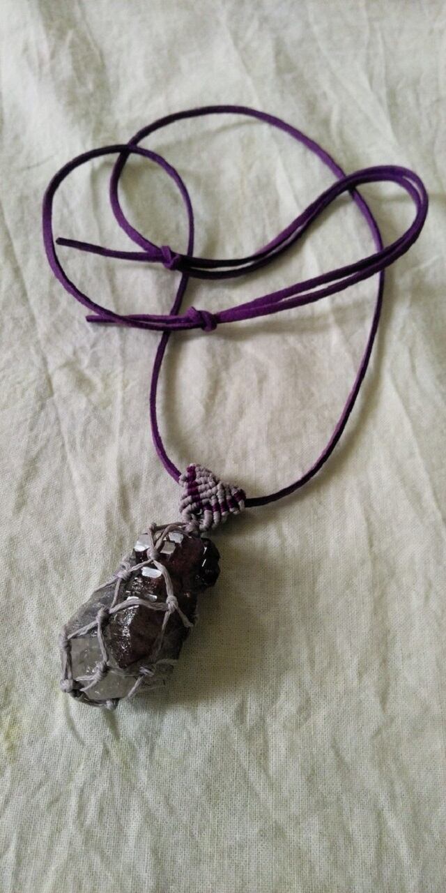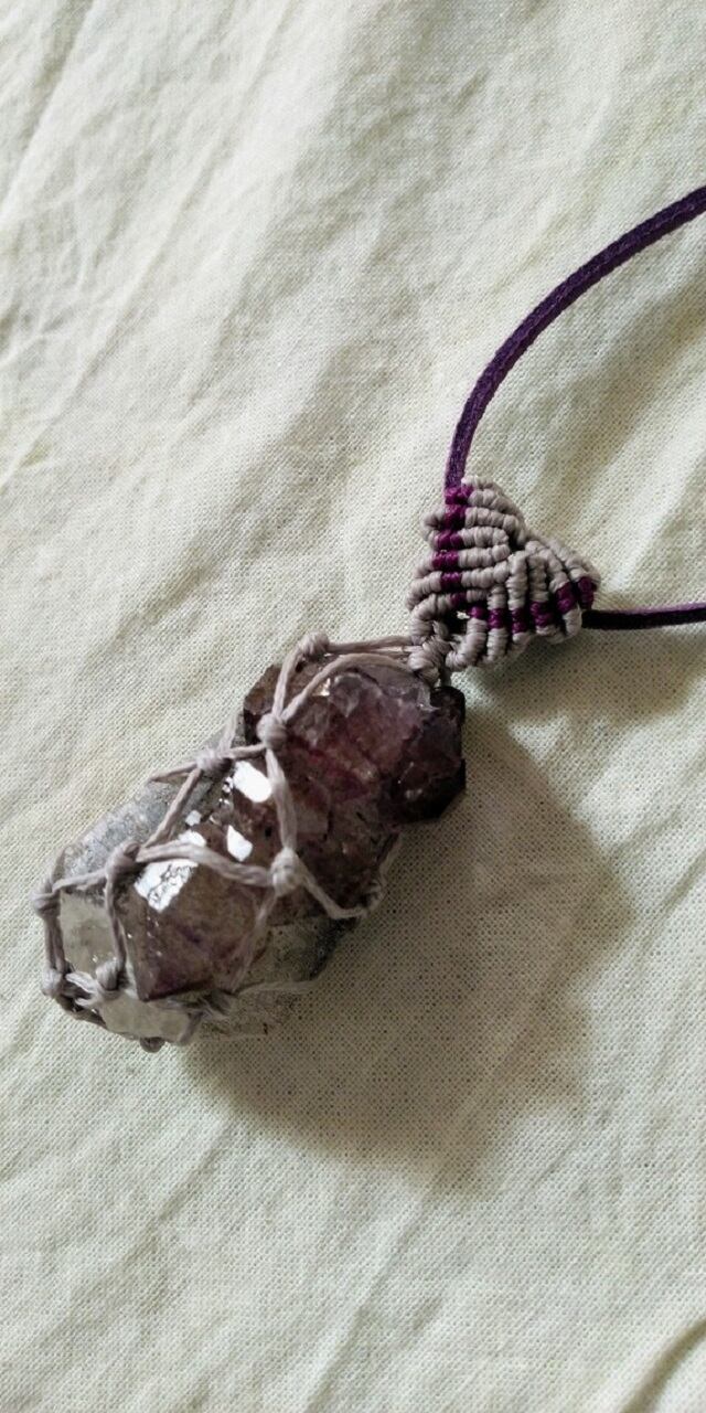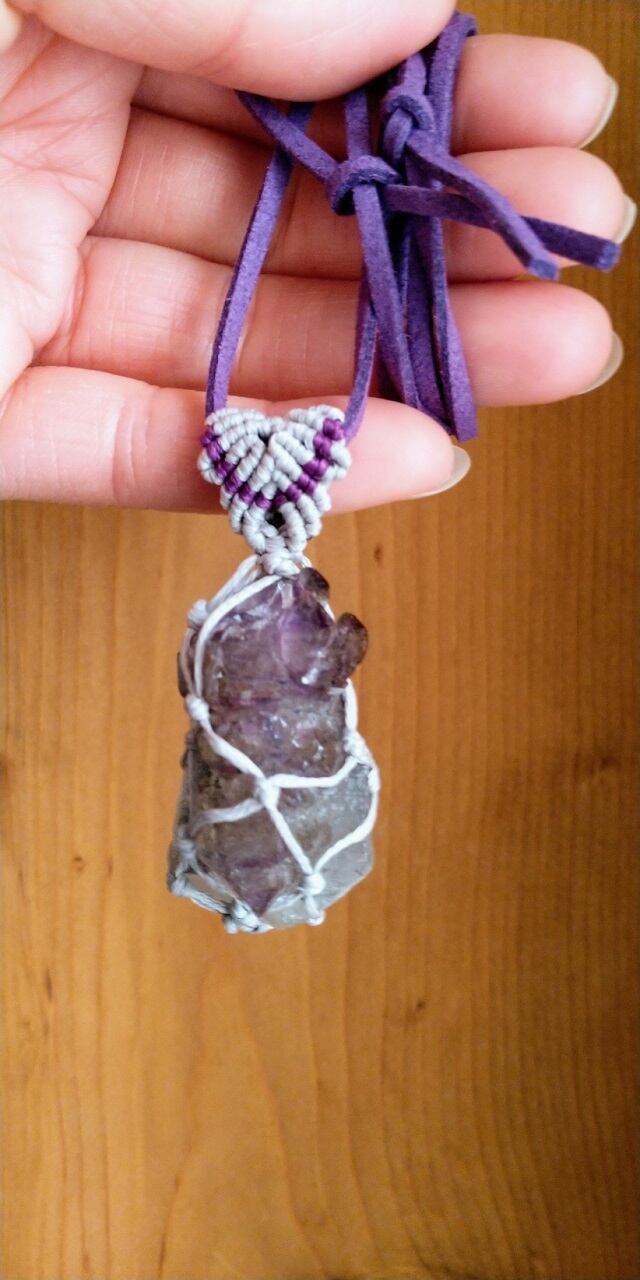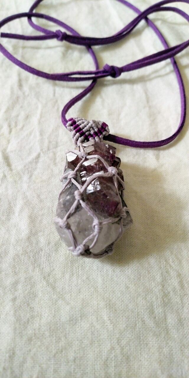 【Rare Stone】ヒマラヤ産 アメジストエレスチャル原石 マクラメ編みデザインペンダントトップ&スエード調紐 重さ約23~24g ポーチ付属
