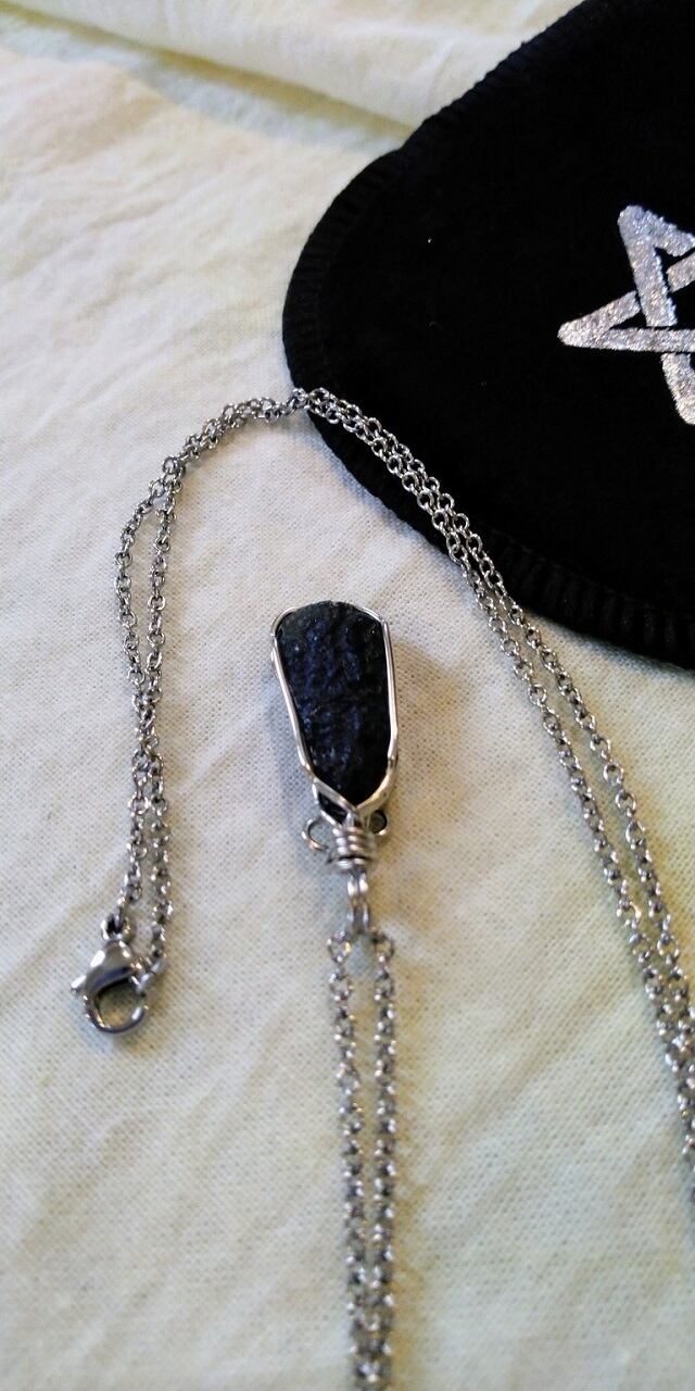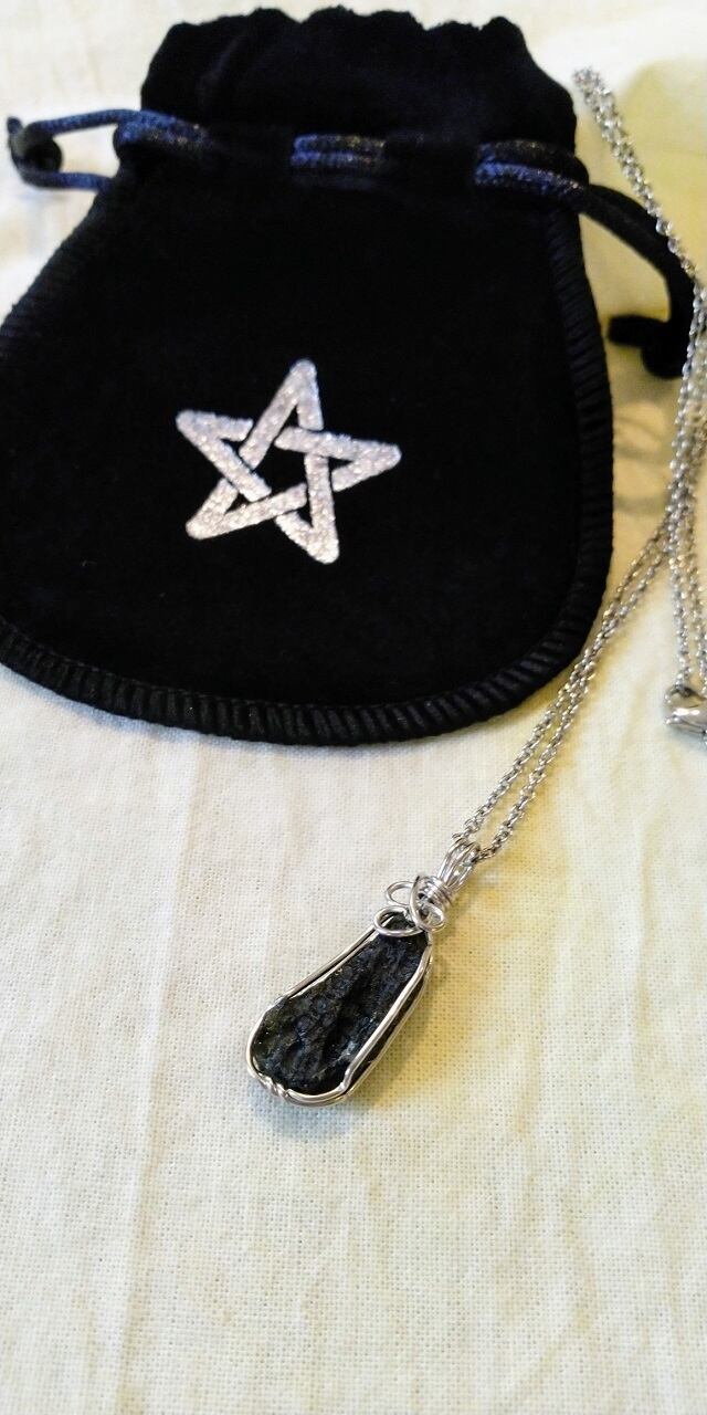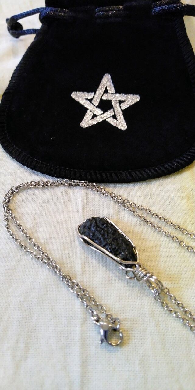 限定品 ✡ チェコスロバキア産 モルダバイト原石ワイヤーデザインペンダントトップ&サージカルステンレス(SUS 316L)チェーン約60㎝ 五芒星デザインポーチ付属