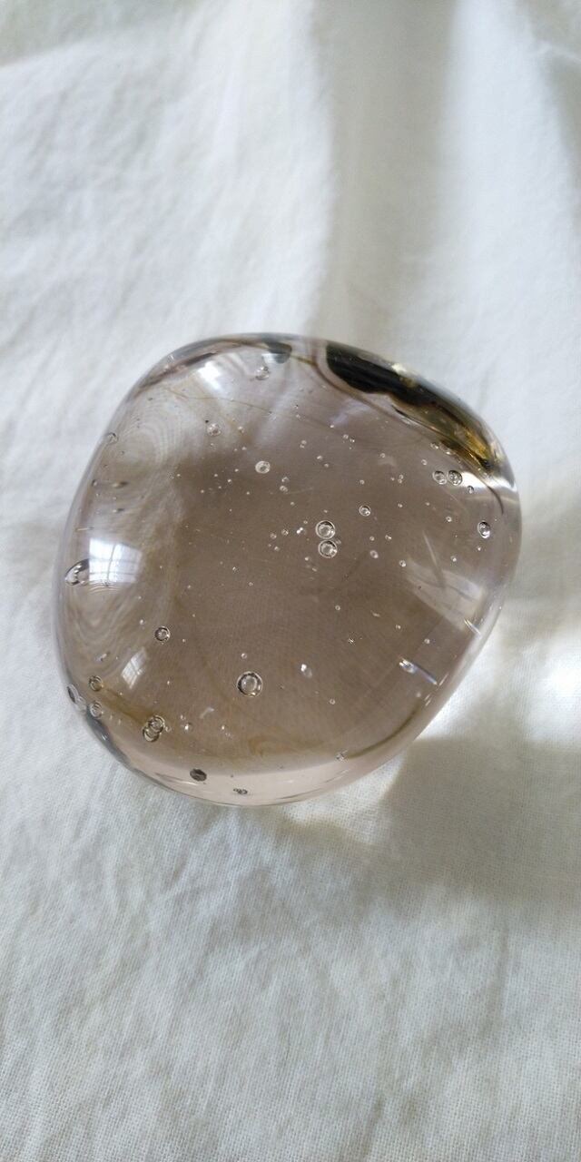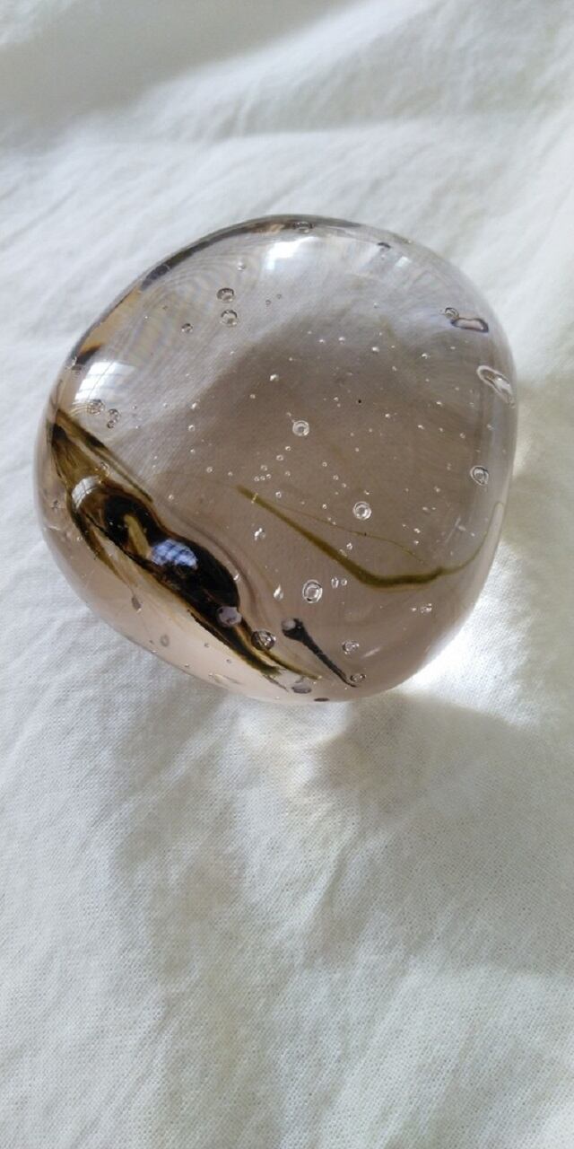 インドネシア産アンダラクリスタルのカラーバリエーションは多様にございますが、こちらはブラウン~モスグリーンカラーがスモーキーブラウンに入り混じるアンダラクリスタルとなります。大小様々、神秘的な気泡(シーフォーム)が宇宙に浮かんでいるようにもみえます。持つ方それぞれ感じ方は異なるでしょうが、まるで龍神様がいて、ベースチャクラからクラウンチャクラを通じ大地と宇宙を繋いでくれるかのようです。強くも優しい波動のアンダラクリスタルだと感じられます。