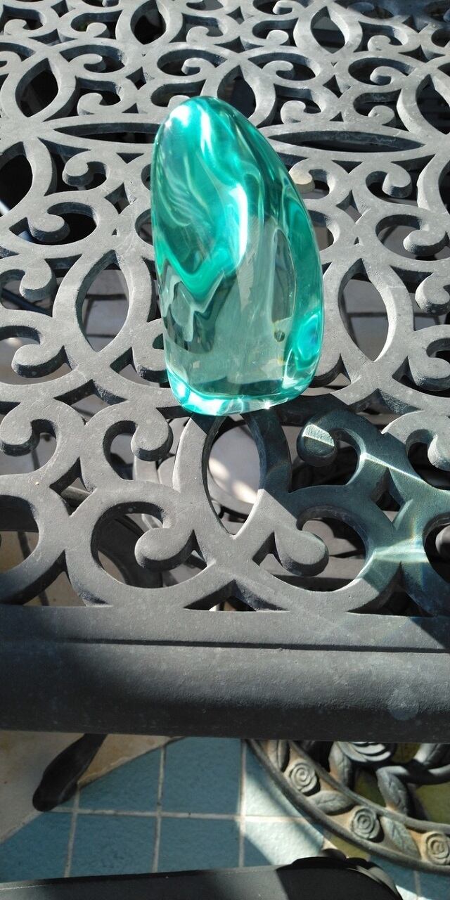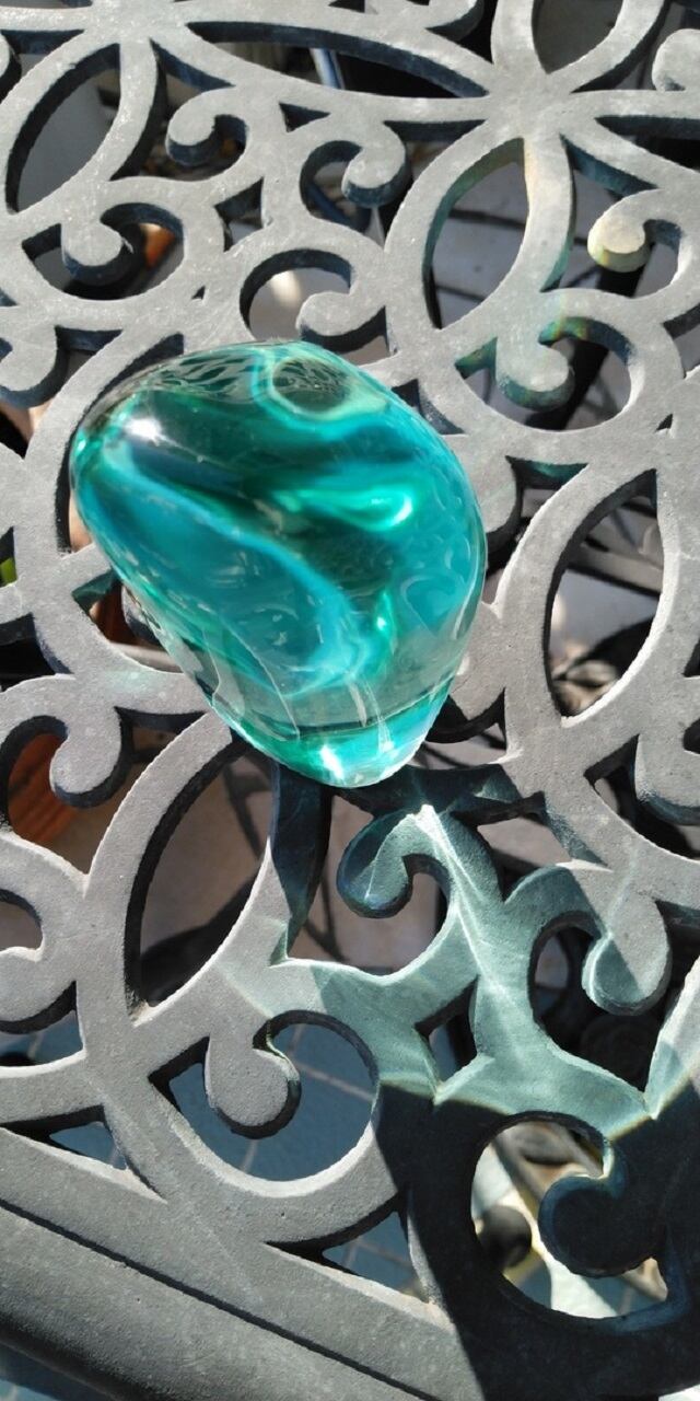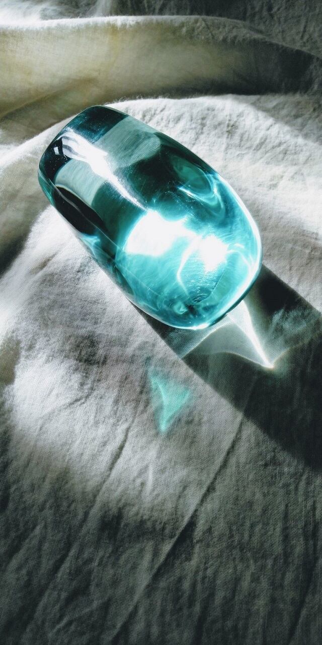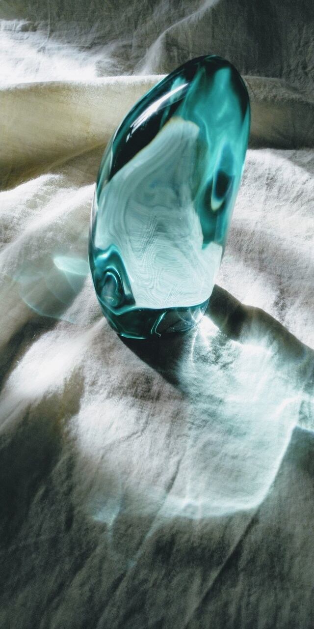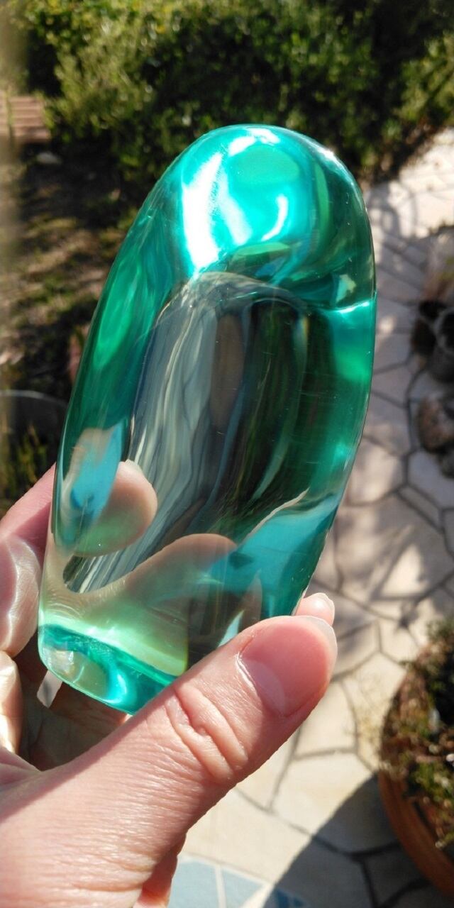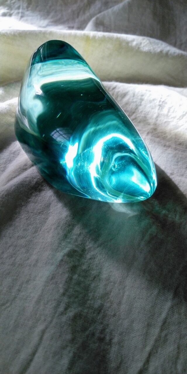 インドネシア産アンダラクリスタルのカラーバリエーションは多様にございますが、こちらは艶めき煌めくライトブルーグリーンのアンダラクリスタルとなります。自立するように磨かれておりますので、様々な角度から色々な表情を見せてくれる大変可愛らしい印象を受けるフリーフォームポリッシュとなります。特にイルカをモチーフにされたという事ではないと思われますが、イルカのフォルムを想像させる手触りも滑らかなカービングだと感じております。目立ったインクルージョンは今のところ見受けられませんが、持つ方の元で何らかの変化があらわれる様な印象を受けるアンダラクリスタルとなります。