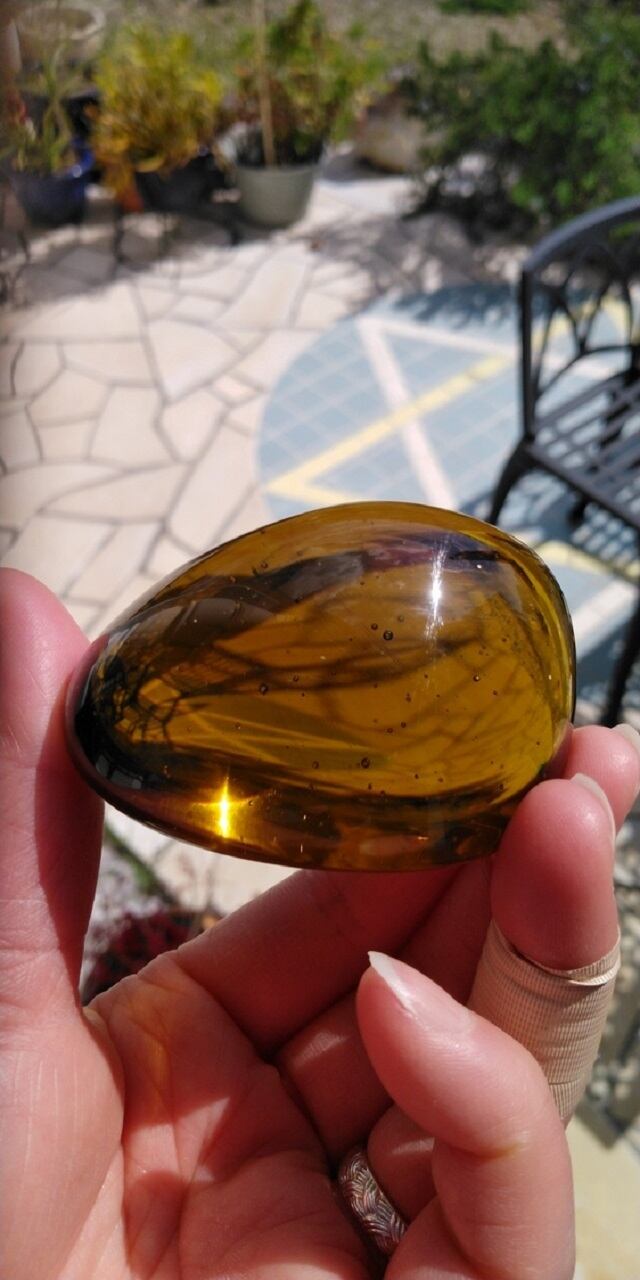 インドネシア産アンダラクリスタルのカラーバリエーションは多様にございますが、こちらは大変落ち着きのあるブラウンカラーのアンダラクリスタルとなります。大小様々なシーフォーム(気泡)が見られ見ているだけでも癒されてしまうのですが、自然光の元では光り輝くコニャックカラーの表情を魅せてくれました。持つ方と大地との更なる繋がりをサポートしてくれるでしょう。