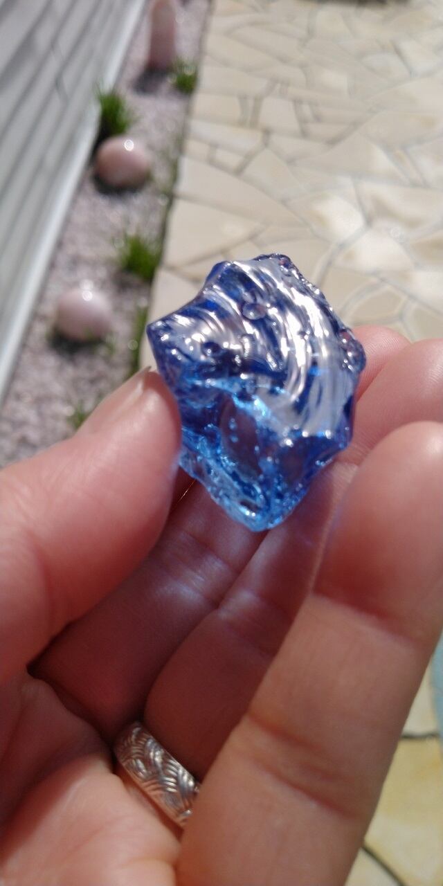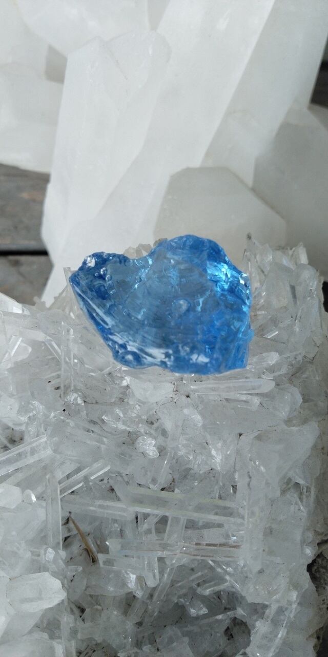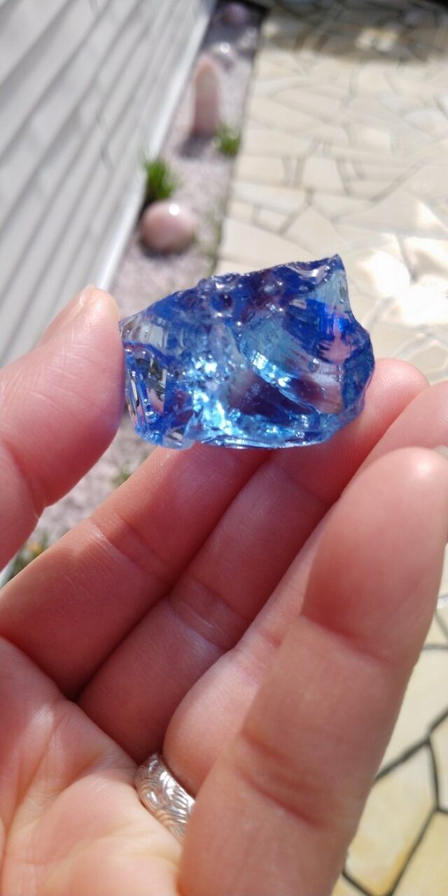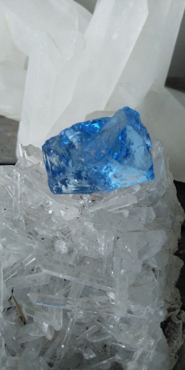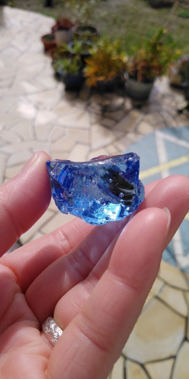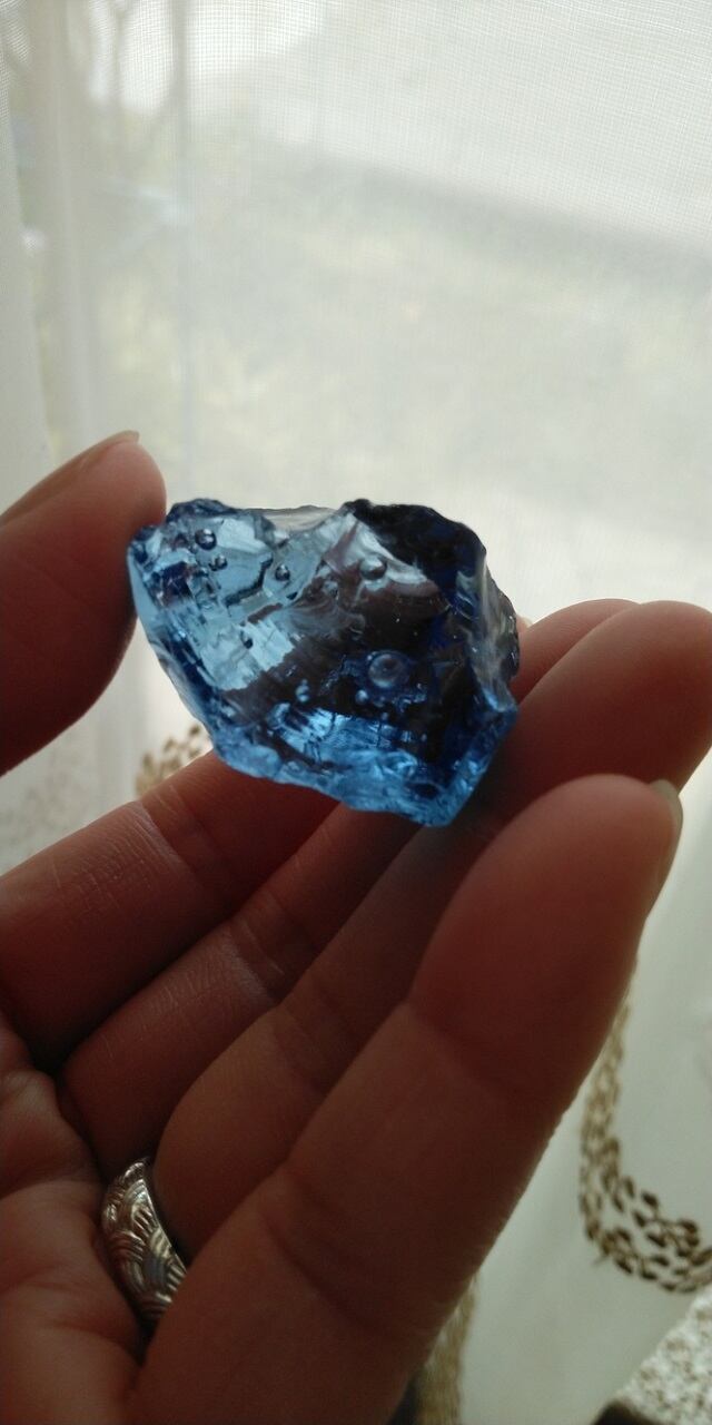 インドネシア産アンダラクリスタルのカラーバリエーションは多様にございますが、こちらは晴れ渡る真夏の青空を想わせるような美しい紺碧色、ドジャーブルーのアンダラクリスタルとなります。そして大小様々なシーフォーム(気泡)が幾つも見られ、見た目にも大変癒されます。画像には写せない大変小さな虹も見受けられます。持つ方それぞれ感じ方は異なるでしょうが、こちらのアンダラクリスタルに触れていると平穏で平和、調和を心ににもたらし、落ち着き優しい気持ちになる、その様な印象を受け取りました。