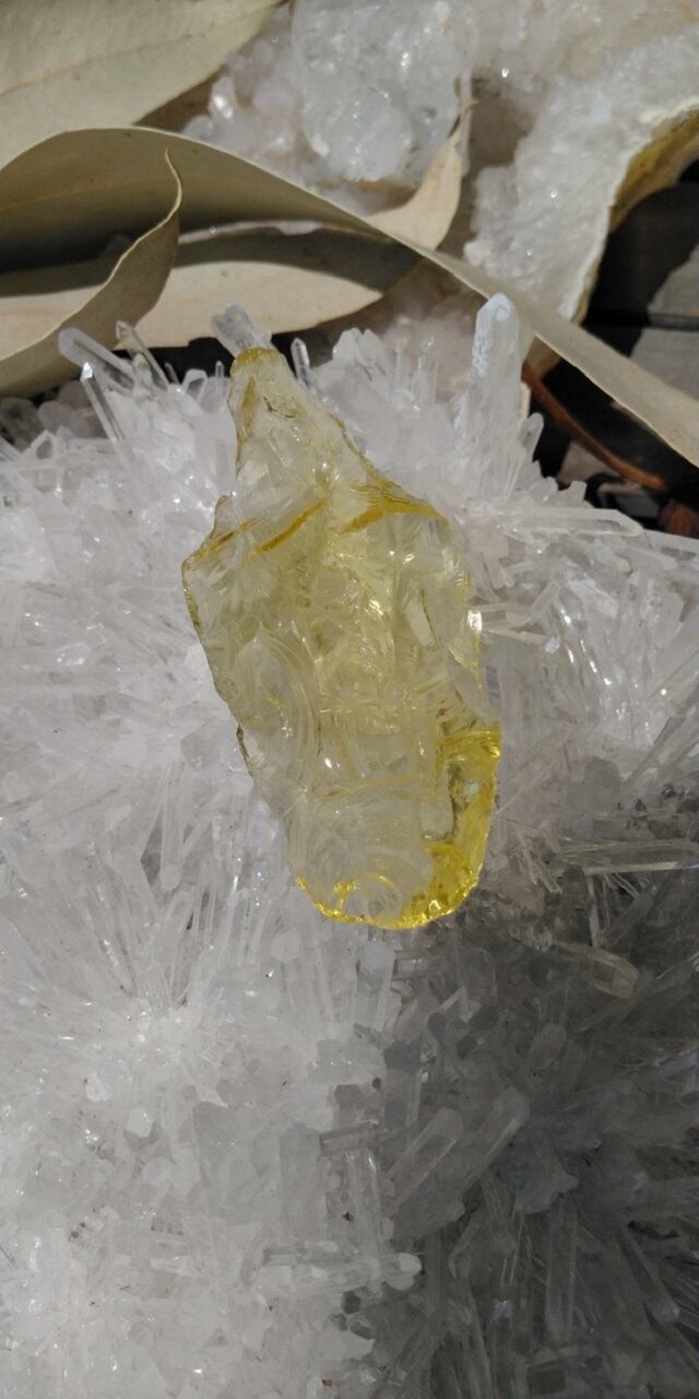 インドネシア産アンダラクリスタルのカラーバリエーションは多様にございますが、こちらは煌めき艶めくイエローのアンダラクリスタルとなります。黄色といえばこの色、というような鮮やかなこちらのイエローは元気溢れる波動を放ち、元気を与えてくれる印象を受けます。表面にあらわれている自然の波模様は、いつまでも見て触れていたいと感じられます。