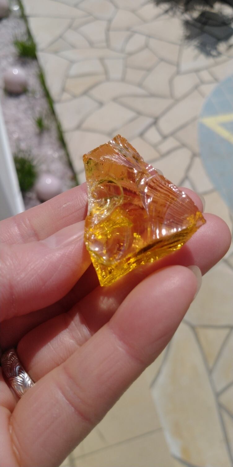 インドネシア産アンダラクリスタルのカラーバリエーションは多様にございますが、こちらは光り輝くゴールデンイエローのアンダラクリスタルとなります。温かみを感じるエネルギッシュな波動を放ち、元気を与えてくれるようです。まるで刻まれたかの様な、くっきりとあらわれた波形にはいつまでも触れていたいと感じさせられます。今のところ目立った気泡は見られませんが、持つ方の元で変化が現れるかもしれません。