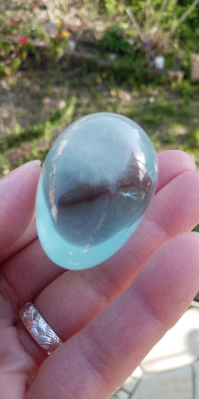 インドネシア産アンダラクリスタルのカラーバリエーションは多様にございますが、こちらは透明感のあるアクアとモフモフに見える白のインクルージョンが共生するアンダラクリスタルとなります。癒しの波動が溢れるアクアは今のところ気泡は見受けられませんが、持つ方の元で変化するかもしれません。光の元でキラキラと美しく元気に輝いてくれます。