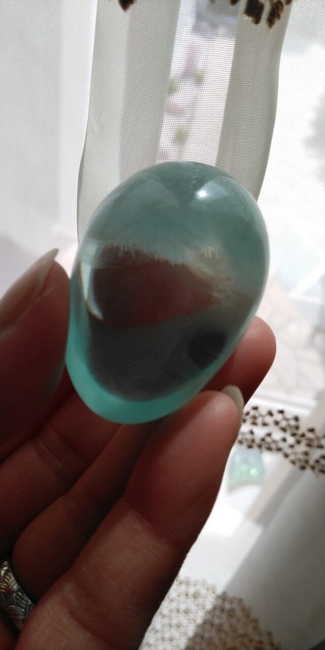 インドネシア産アンダラクリスタルのカラーバリエーションは多様にございますが、こちらは透明感のあるアクアとモフモフに見える白のインクルージョンが共生するアンダラクリスタルとなります。癒しの波動が溢れるアクアは今のところ気泡は見受けられませんが、持つ方の元で変化するかもしれません。光の元でキラキラと美しく元気に輝いてくれます。