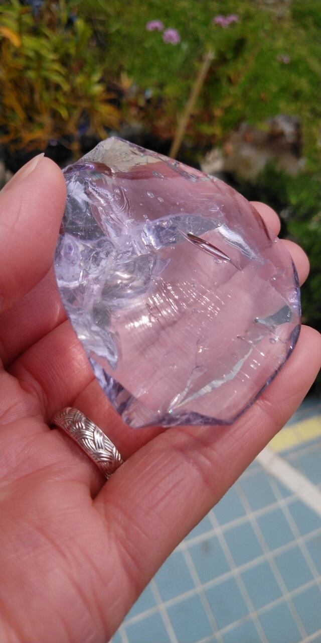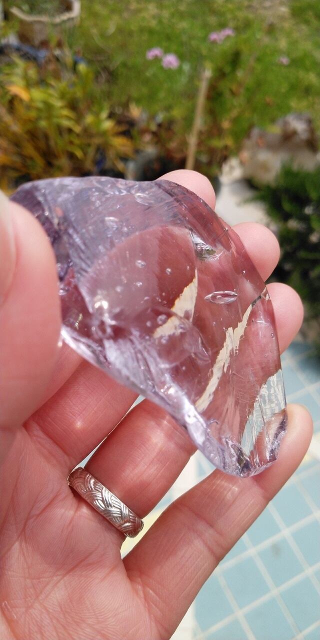アンダラクリスタルのカラーバリエーションは多く見られますが、こちらは艶めき煌めき、大変優美な印象を受けるアセンダントライラックとなります。レアカラーとしてしられ、このボリューム感のライラックは初めての入手となります。ライラックカラーが波模様のように見られ、大小さまざまなシーフォーム(気泡)や虹も見受けられます。マーキース型のシーフォーム(気泡)が表面に現れ凹んでいるのですが、刻まれたかのようにも見え、まるで女神様の穏やかな瞳に見つめられている様にも感じられます。持つ方の神聖な自己との繋がりを強化し、本来のあなたを知る時がやってきたのではないでしょうか。