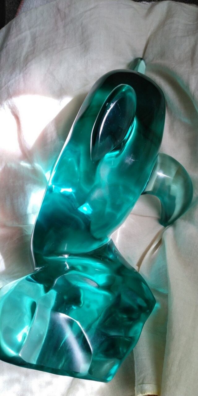 インドネシア産アンダラクリスタルのカラーバリエーションは多様にございますが、こちらは当方も含め惹かれる方の多いブルーグリーンのアンダラクリスタルとなります。神秘的なシーフォーム(気泡)が複数個所(背びれ、胸びれ、お顔辺り等)見られます。見つめ触れていると、心落ち着き優しい気持ちになる印象を受けます。自立は勿論いたしますが、ふわふわのクッション等に横向きに寝かせてあげたとしても、生き生きとしたドルフィンの表情は豊かな印象を受けます。精巧な研磨に感動するほどの優しい表情、雰囲気に包まれている一点物のドルフィンとなります。