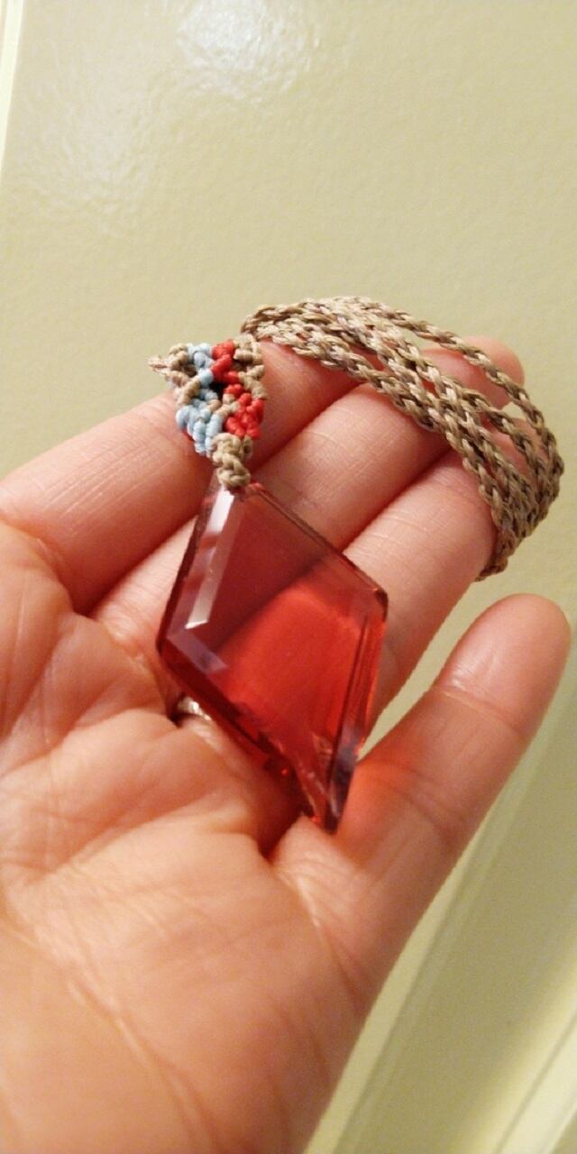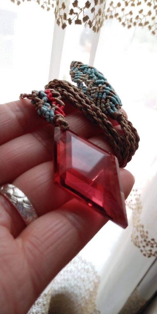 【限定品】インドネシア産 アンダラクリスタル ラズベリー 多角面スクエアカット マクラメ編みデザインネックレス 紐長さ調節約88㎝位まで可能 重さ約13g ポーチ付属
