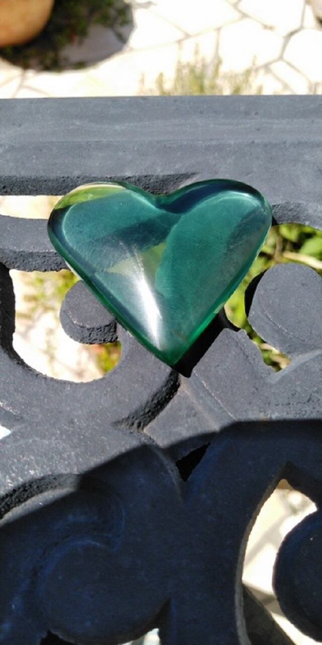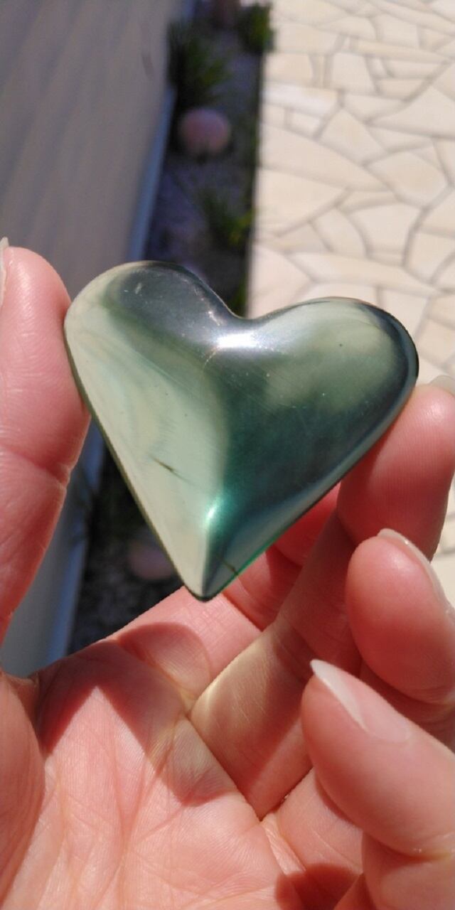インドネシア産アンダラクリスタルのカラーバリエーションは多様にございますが、こちらは当方も含め惹かれる方の多いブルーグリーンのアンダラクリスタルとなります。神秘的なシーフォーム(気泡)と内包物(ライン)が見られます。この美しい色合いとハートシェイプを見つめ触れていると、心落ち着き優しい気持ちになる印象を受けます。