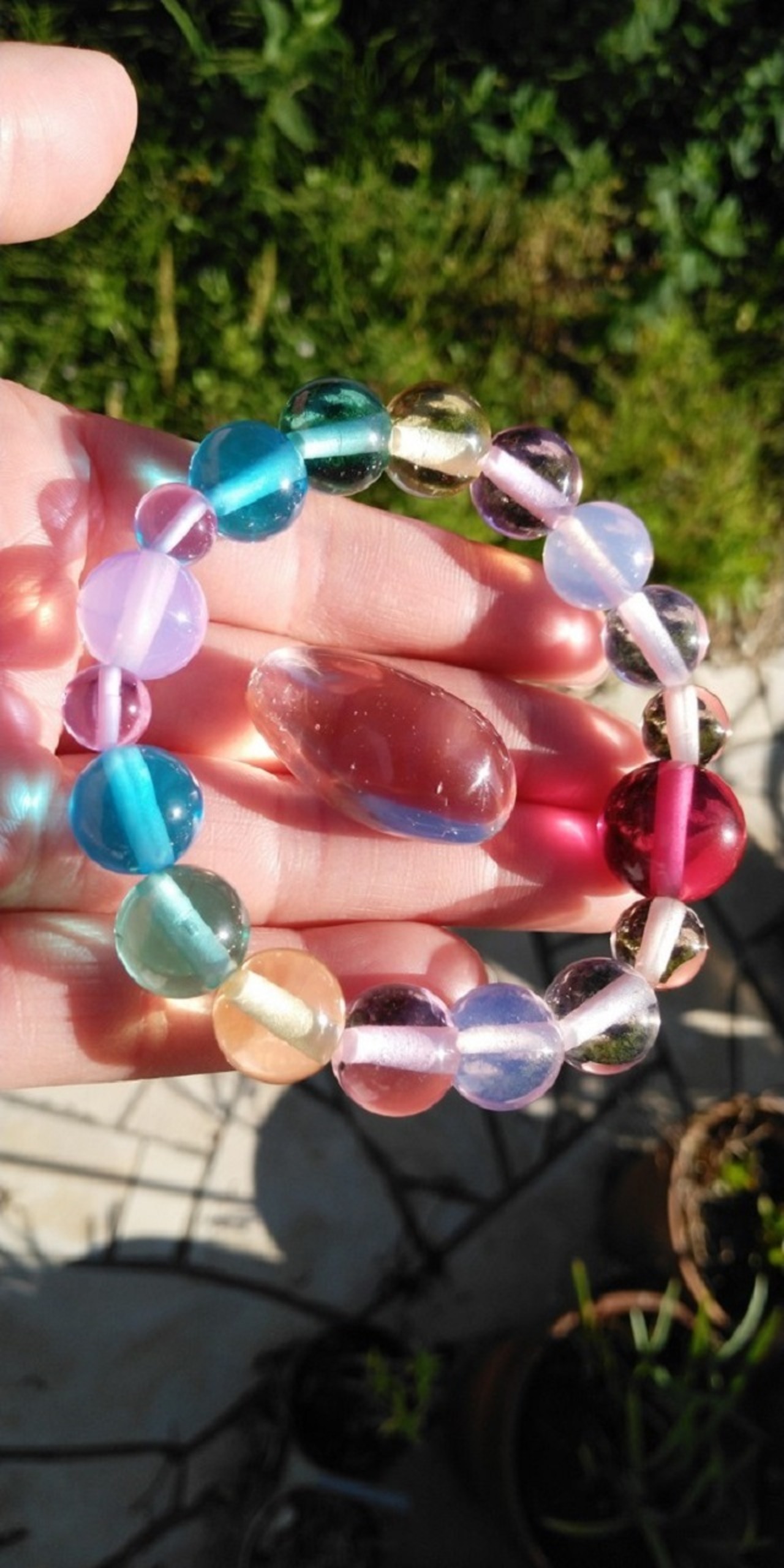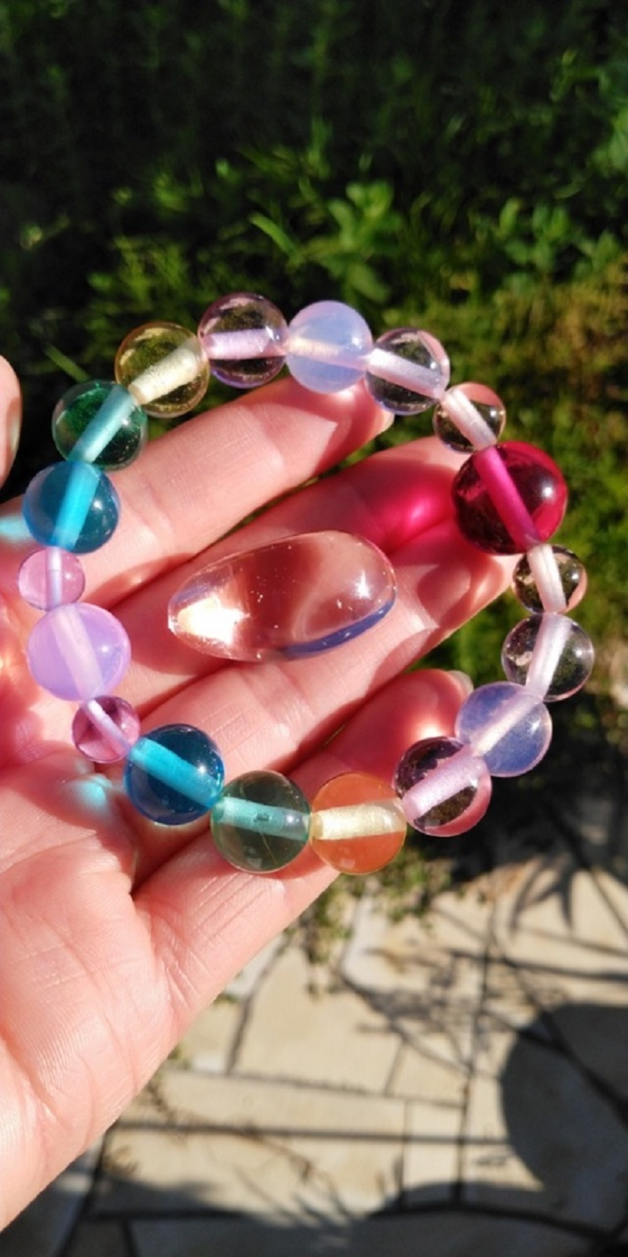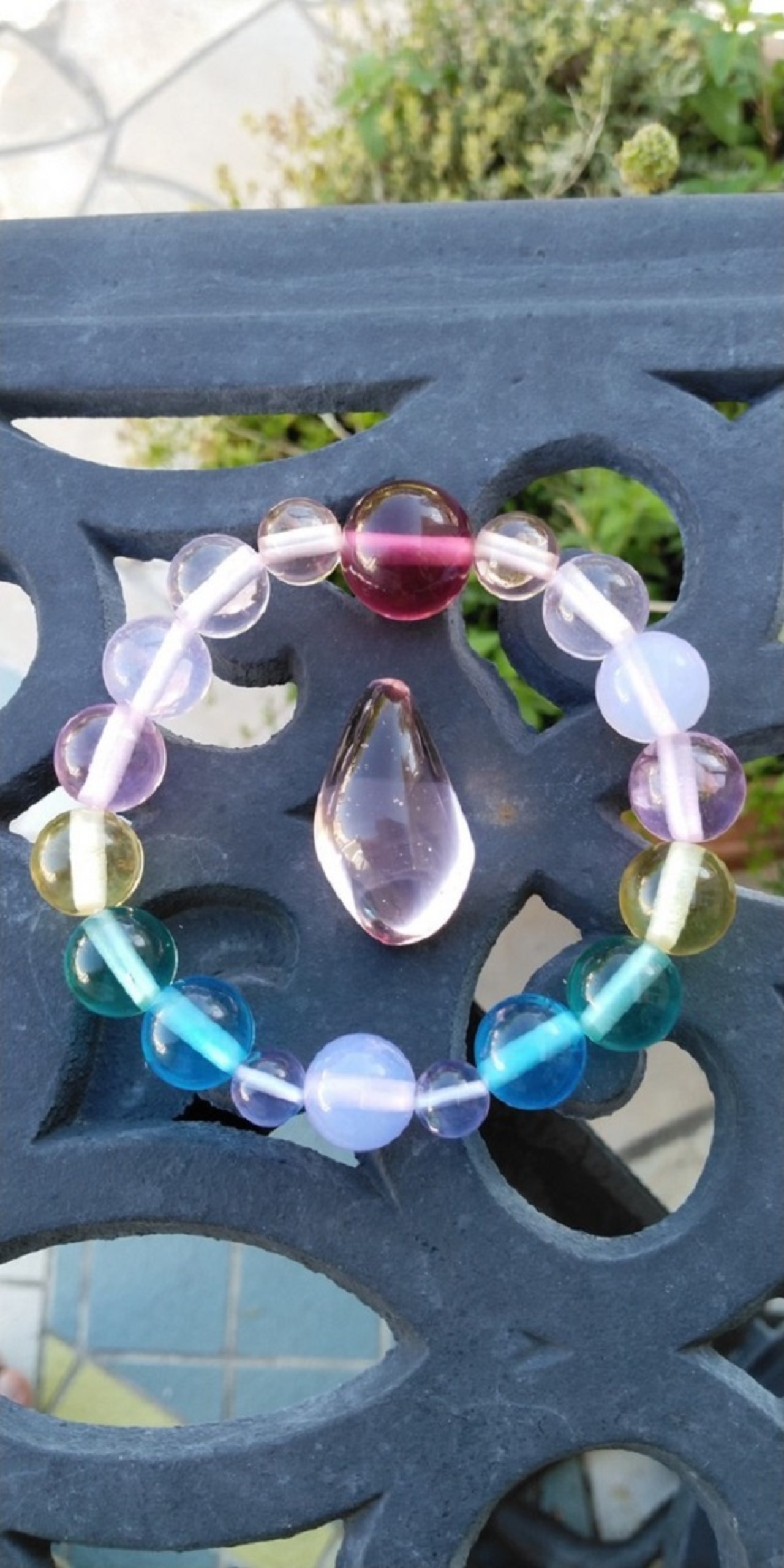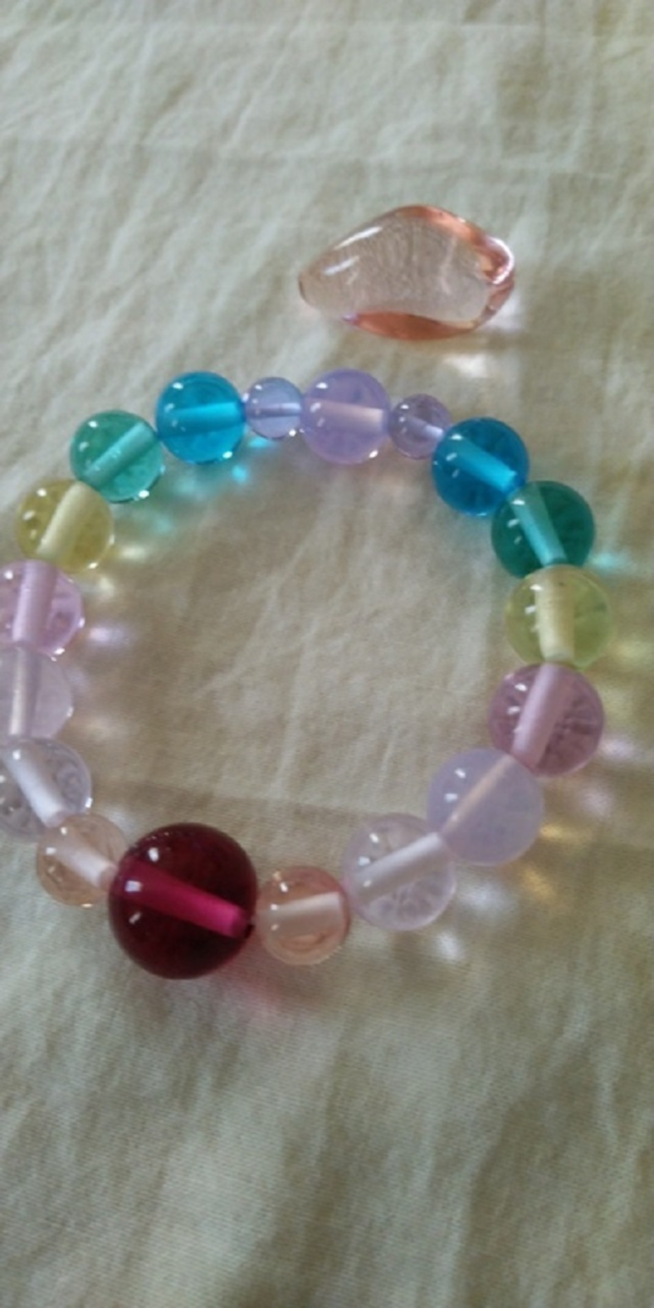 石:インドネシア産アンダラクリスタル 10種類使用 約8㎜~約14㎜(丸珠)【ラズベリーピンク、アプリコット、ライトピンク、オパールピンク(ミルキーピンク)、ピンク、ライトイエロー、ブルーグリーン、ライトブルー、ライラック、オパールライラックピンク(ミルキーライラックピンク)、順不同】