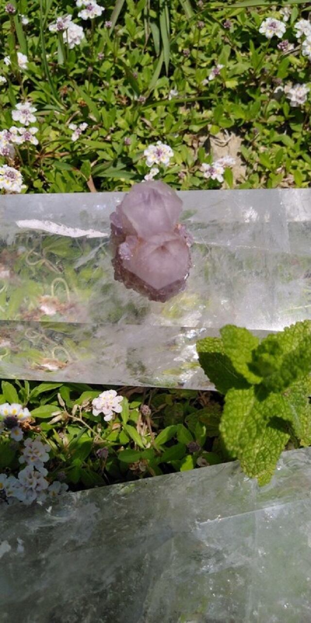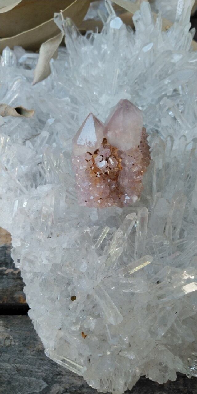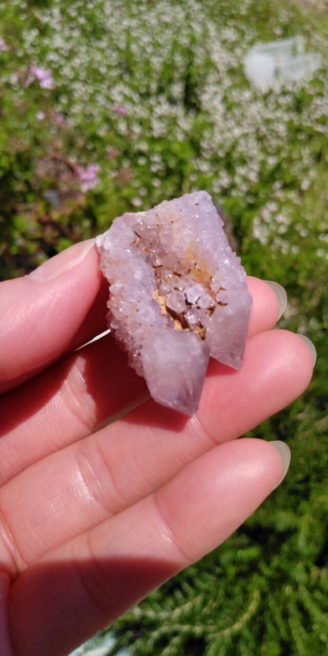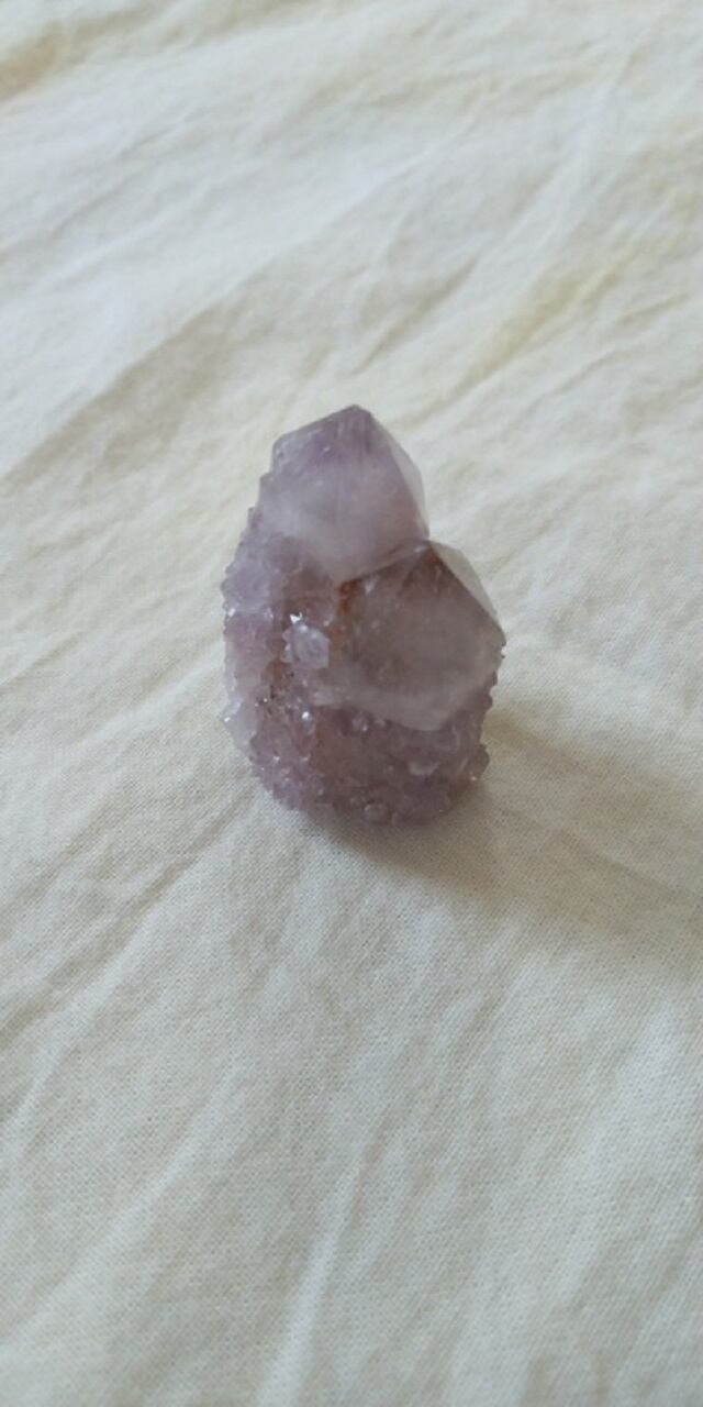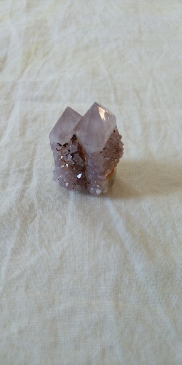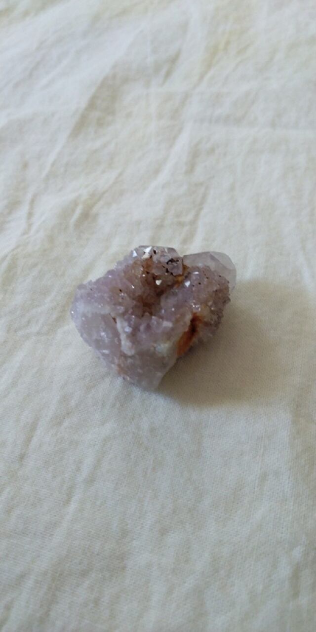 カクタスクォーツは2つの種類あり、結晶が大きくはっきりしているものをスピリットクォーツ、ドゥルージー(晶洞)のように、砂糖をまぶしたような小さな結晶がキラキラと粒状に覆っているものを、フェアリークォーツと呼んだりいたします。