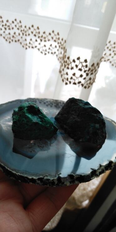こちらのエイラットストーンはイスラエル産となります。ネックレスに編もうと入手したのですが、原石のまま二個セットにて販売させていくこととなりました。人それぞれ感じ方は異なるでしょうが、両手に持つとまず最初に心地良いエネルギーがハートへ感じられるのです。それからよりそのエネルギーは広がりを増し、肩甲骨や第三の眼、頭上のチャクラ等を活性化してくれるようです。持つ方の波動やエネルギーに対応し、エイラットストーンのエネルギーは変化するように感じられます。