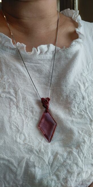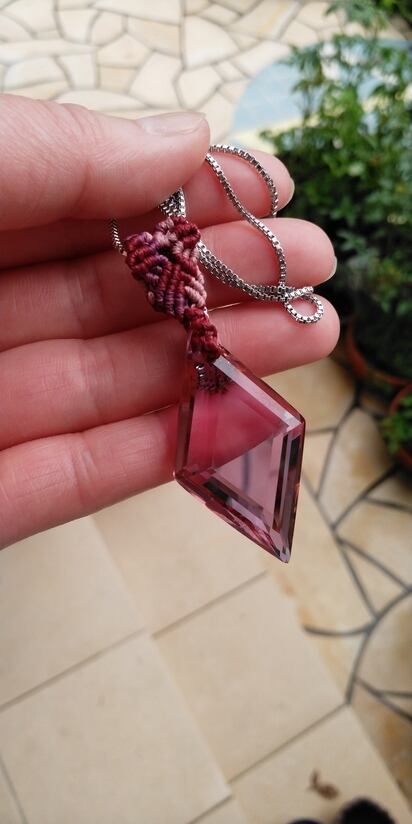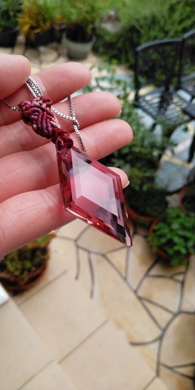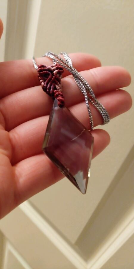インドネシア産 アンダラクリスタル インディアンレッド(カラーチェンジ)多角面スクエアカット マクラメ編みデザインペンダントトップ&ステンレススチール316L ベネチアンチェーン 約60㎝ 重さ約14g ポーチ付属