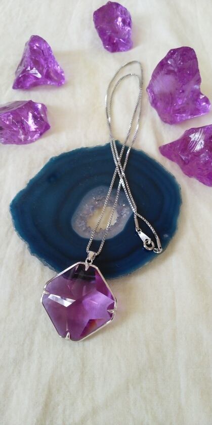 E様によるオーダー ✡ 煌めくクロス(十字)デザイン インドネシア産アンダラクリスタル パープルピンク(カラーチェンジ)ペンダントトップ & ステンレススチール316L チェーン(約60㎝)ポーチ付属
