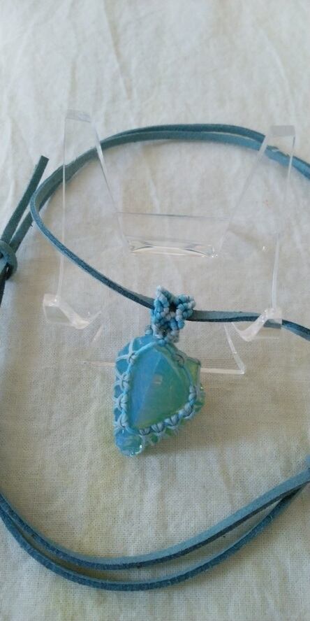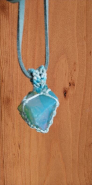 感謝プライス ✡ インドネシア産 アンダラクリスタル ミルキーライトブルーグリーン マクラメ編みペンダントトップ&スエード調紐 重さ約12~13g