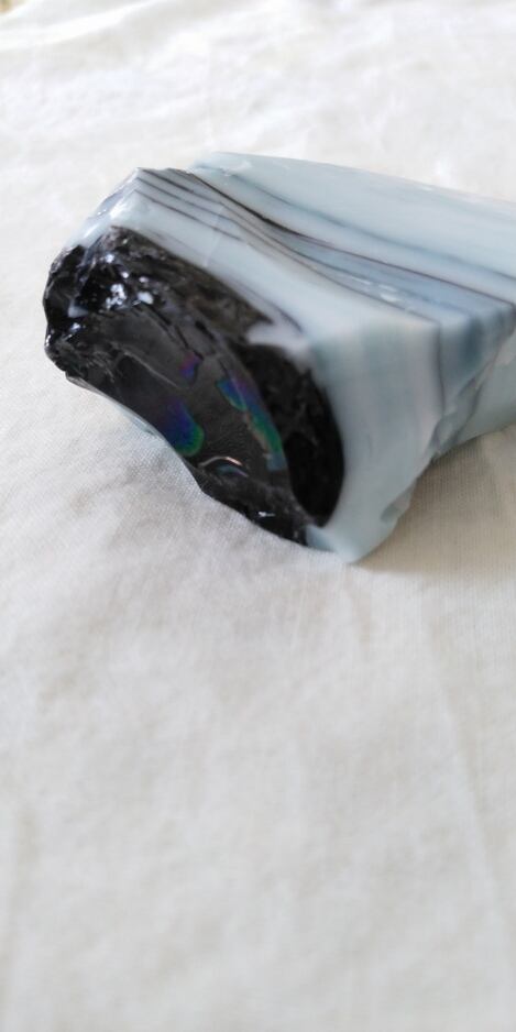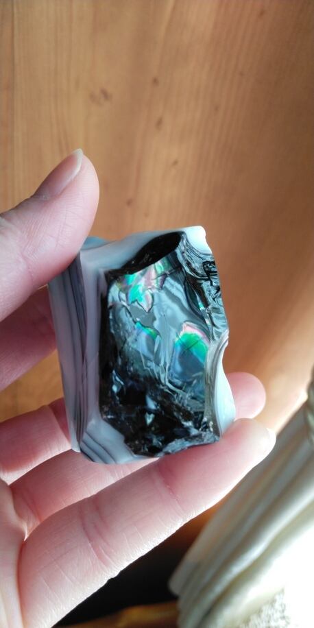 アンダラクリスタルのカラーバリエーションは多く見られますが、こちらはレアなミックスカラーのアンダラクリスタルとなります。イリジウム ブラックとマルチパステルブルートパーズが入り混じるお色目となり、イリジウムブラック部分には美しい虹が鮮明にみられ、パワフルな波動を放つのです。層の様にお色目が入り混じる部分や気泡由来による凹みが幾つか見られ、大変神秘的な印象を受けるのです。人それぞれ感じ方は異なるでしょうが、持つ方のグラウンディング力、御護り、魔除け、透視能力、コミュニケーション能力等の向上のサポート、そして強力でワンオクターブ上の波動を放つ印象を受けるスペシャルなワンピースとなります。