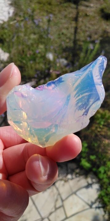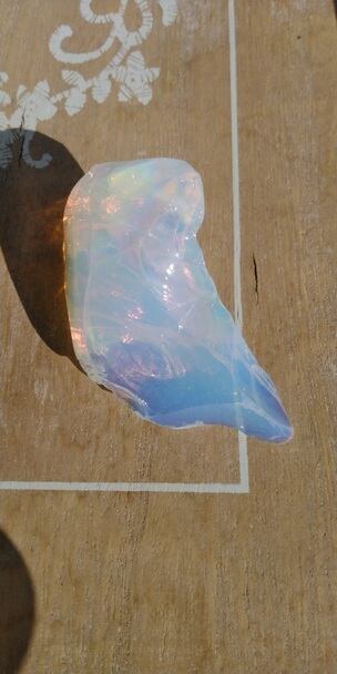 アンダラクリスタルのカラーバリエーションは多く見られますが、こちらは当ショップでも特に人気の高いホワイトオパールとなります。エンジェルオーラともいわれる神秘的な美しい色合いを魅せてくれるのです。光の質や当たり方により、煌めきとカラーチェンジするかのような美しい色合いは、視覚からも癒されます。手にするとクラウンチャクラがオープンとなり、天使のような優しくも心強いエネルギーが全チャクラを活性化、そして癒してくれる印象を受けるアンダラクリスタルとなります。人それぞれ感じ方は異なるでしょうが、まるで刻まれたかの様な波打つエッジは見て触れていると癒されてしまうのです。瞑想時にはサポートストーンとなってくれるでしょう。微細なシーフォーム(気泡)が見られます。