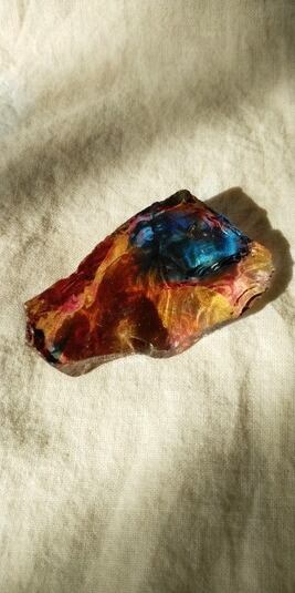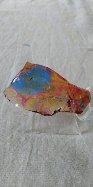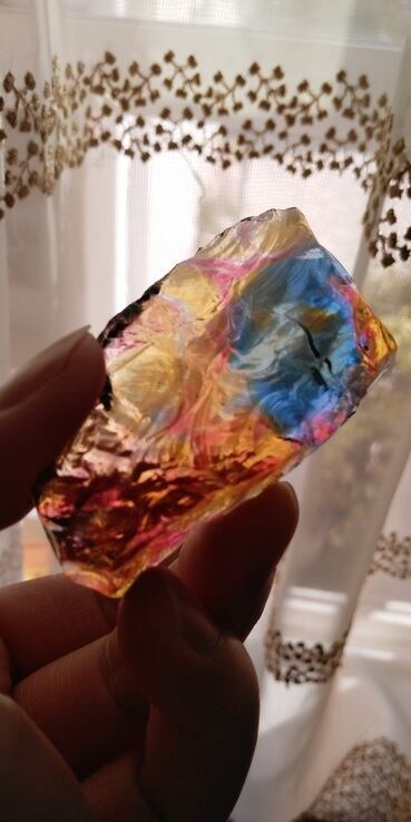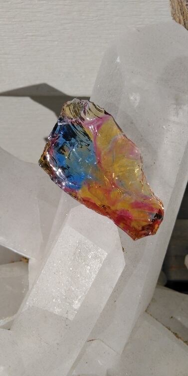 インドネシア産アンダラクリスタルのカラーバリエーションは多様にございますが、こちらは神秘的なマルチカラーとなります。ブルーやイエローをメインに、ラズベリーやオレンジ、パープル、クリアカラーが入り混じっており、透明感抜群の美しいワンピースです。人それぞれ感じ方は異なるでしょうが、艶々というよりは荒々しい表面をしておりアーティスティックな印象を受けるのです。全体的に深く刻まれた様なエッジからはとても強いエネルギーが感じられる、ワンオクターブ上のアンダラクリスタルではないでしょうか。微細なシーフォーム(気泡)もみられるスペシャルなワンピースとなります。