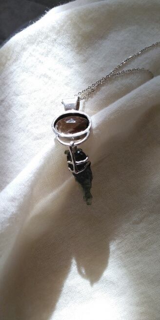 宇宙を感じられるガラス質隕石のモルダバイトとグラウンディングのスモーキークォーツの二種類の石を使用した、神秘的で美しい一点物のペンダントトップとなります。モルダバイトが左右に揺らめくユニークなデザインとなります。人それぞれ感じ方は異なるでしょうが、透明感のある濃厚なブラウンカラーのスモーキークォーツを見つめていると心身ともに落ちつくのです。